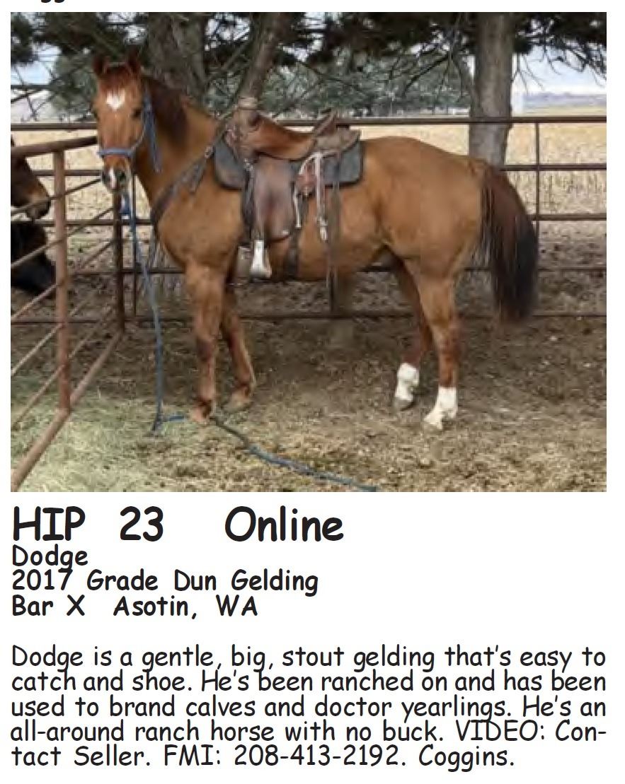 Dodge - 2017 Grade Dun Gelding - Bar X, Asotin, WA - Dodge is a gentle, big, stout gelding that’s easy to catch and shoe. He’s been ranched on and has been used to brand calves and doctor yearlings. He’s an all-around ranch horse with no buck. VIDEO: Contact Seller. FMI: 208-413-2192. Coggins.