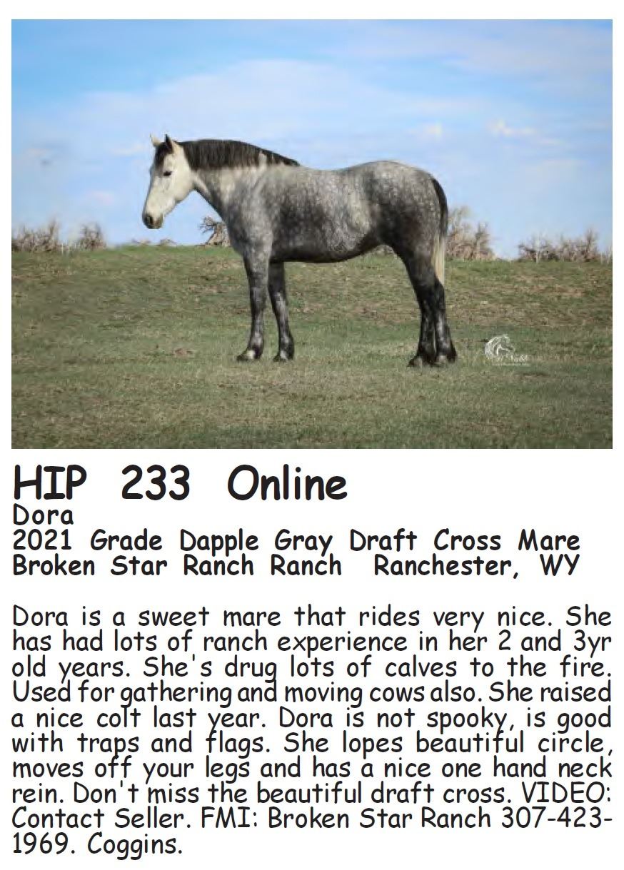 Dora - 2021 Grade Dapple Gray Draaft Cross Mare - Broken Star Ranch Ranch, Ranchester, WY - Dora is a sweet mare that rides very nice. She has had lots of ranch experience in her 2 and 3yr old years. She's drug lots of calves to the fire. Used for gathering and moving cows also. She raised a nice colt last year. Dora is not spooky, is good with traps and flags. She lopes beautiful circle, moves off your legs and has a nice one hand neck rein. Don't miss the beautiful draft cross. VIDEO: Contact Seller. FMI: Broken Star Ranch 307-423-1969. Coggins.