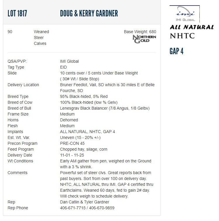 Comments Powerful set of steer clvs. Great reports back from past buyers. Sort from over 100 on delivery day. NHTC, ALL NATURAL thru IMI. GAP 4 certified thru Earthclaims. Weaned 60 days, fed to gain 2# day. Will check weigh to schedule delivery.