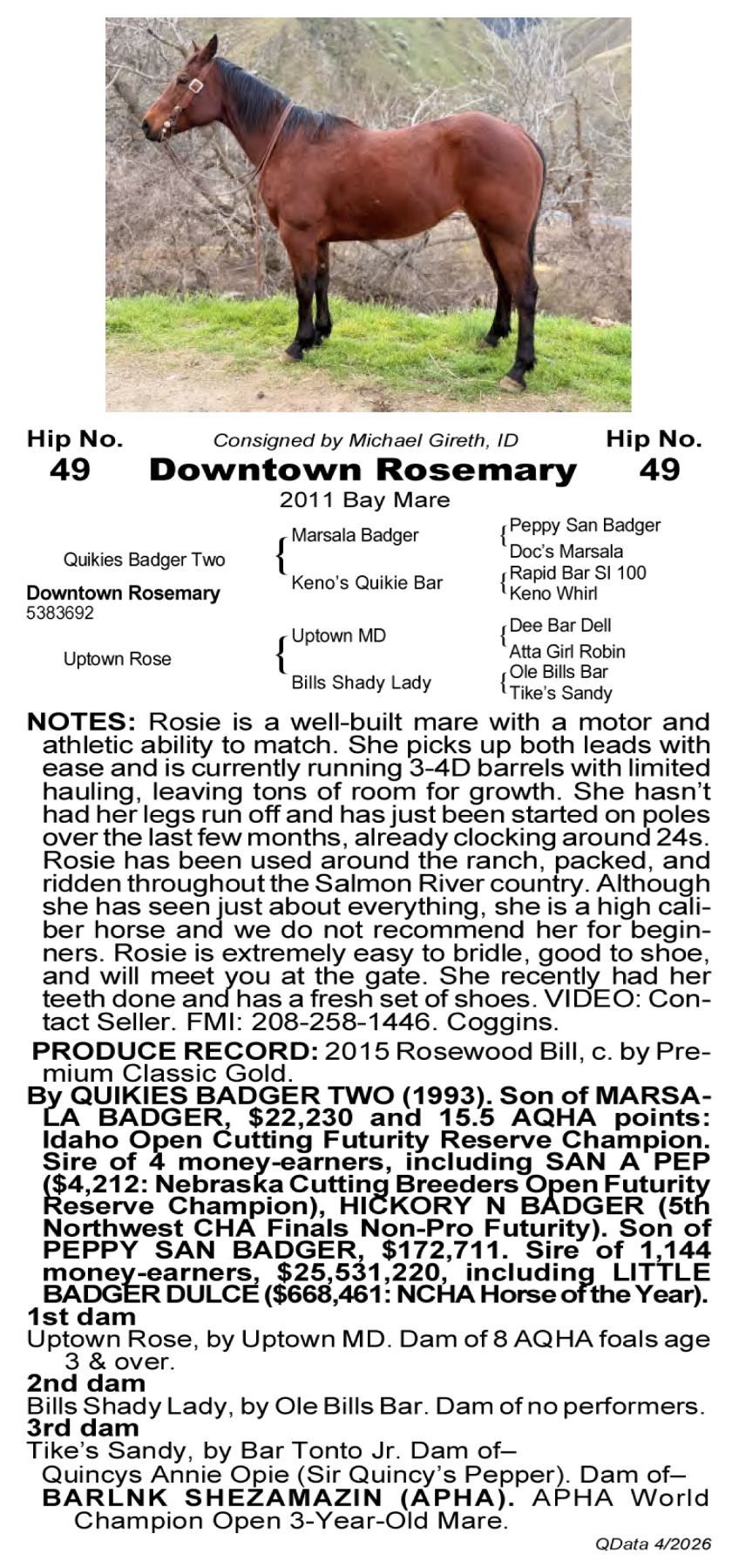 Downtown Rosemary -5383692 - 2011 AQHA Bay Mare - Michael Gireth, Lucile, ID - Rosie is a well-built mare with a motor and athletic ability to match. She picks up both leads with ease and is currently running 3–4D barrels with limited hauling, leaving tons of room for growth. She hasn’t had her legs run off and has just been started on poles over the last few months, already clocking around 24s. Rosie has been used around the ranch, packed, and ridden throughout the Salmon River country. She crosses water, handles bridges confidently, and does well around dogs. Although she has seen just about everything, she is a high caliber horse and we do not recommend her for beginners. Rosie is extremely easy to bridle, good to shoe, and will meet you at the gate no matter how hard she was ridden the day before. She recently had her teeth done and has a fresh set of shoes. VIDEO: Contact Seller. FMI: 208-258-1446. Coggins.