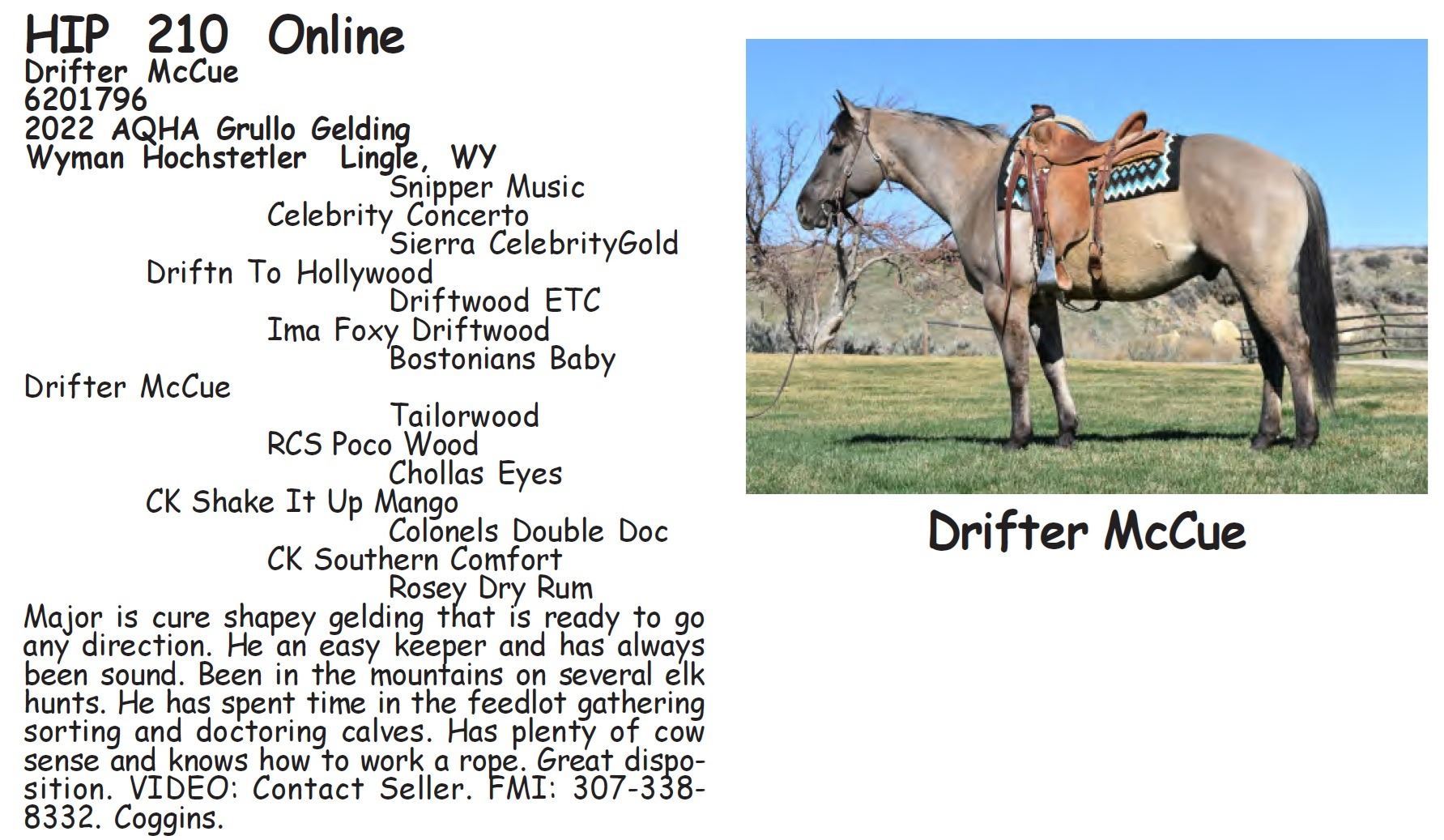 Drifter McCue - 6201796 - 2022 AQHA Grullo Gelding - Wyman Hochstetler, Lingle, WY - Major is cure shapey gelding that is ready to go any direction. He an easy keeper and has always been sound. Been in the mountains on several elk hunts. He has spent time in the feedlot gathering sorting and doctoring calves. Has plenty of cow sense and knows how to work a rope. Great disposition. VIDEO: Contact Seller. FMI: 307-338-8332. Coggins.