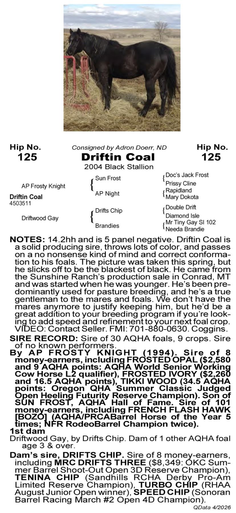Driftin Coal - 4503511 - 2004 AQHA Black Stallion - Adron Doerr, Zap, ND - 14.2hh and is 5 panel negative. Driftin Coal is a solid producing sire, throws lots of color, and passes on a no nonsense kind of mind and correct conformation to his foals. The picture was taken this spring, but he slicks off to be the blackest of black. He came from the Sunshine Ranch’s production sale in Conrad, MT and was started when he was younger. He’s been predominantly used for pasture breeding, and he’s a true gentleman to the mares and foals. We don’t have the mares anymore to justify keeping him, but he’d be a great addition to your breeding program if you’re looking to add speed and refinement to your next foal crop. VIDEO: Contact Seller. FMI: 701-880-0630. Coggins.