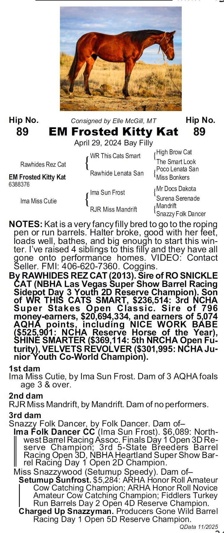 2024 AQHA Bay Mare x Rawhides Rez Cat x WR This Cats Smart out of Ima Miss Cutie x Ima Sun Frost. Kat is a very fancy filly bred to go to the roping pen or run barrels. Halter broke, good with her feet, loads well, bathes, and big enough to start this winter. I've raised 4 siblings to this filly and they have all gone onto performance homes. VIDEO: Contact Seller. FMI: 406-620-7360. Coggins.