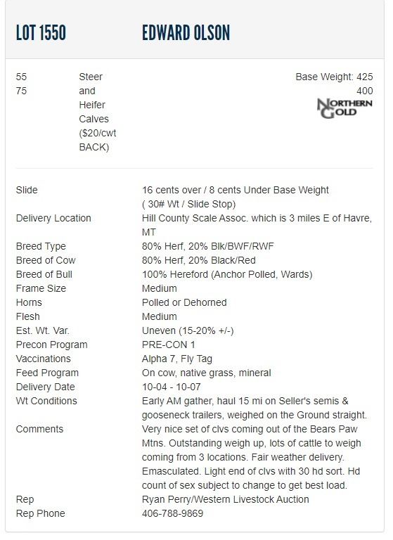 Comments Very nice set of clvs coming out of the Bears Paw Mtns. Outstanding weigh up, lots of cattle to weigh coming from 3 locations. Fair weather delivery. Emasculated. Light end of clvs with 30 hd sort. Hd count of sex subject to change to get best load.