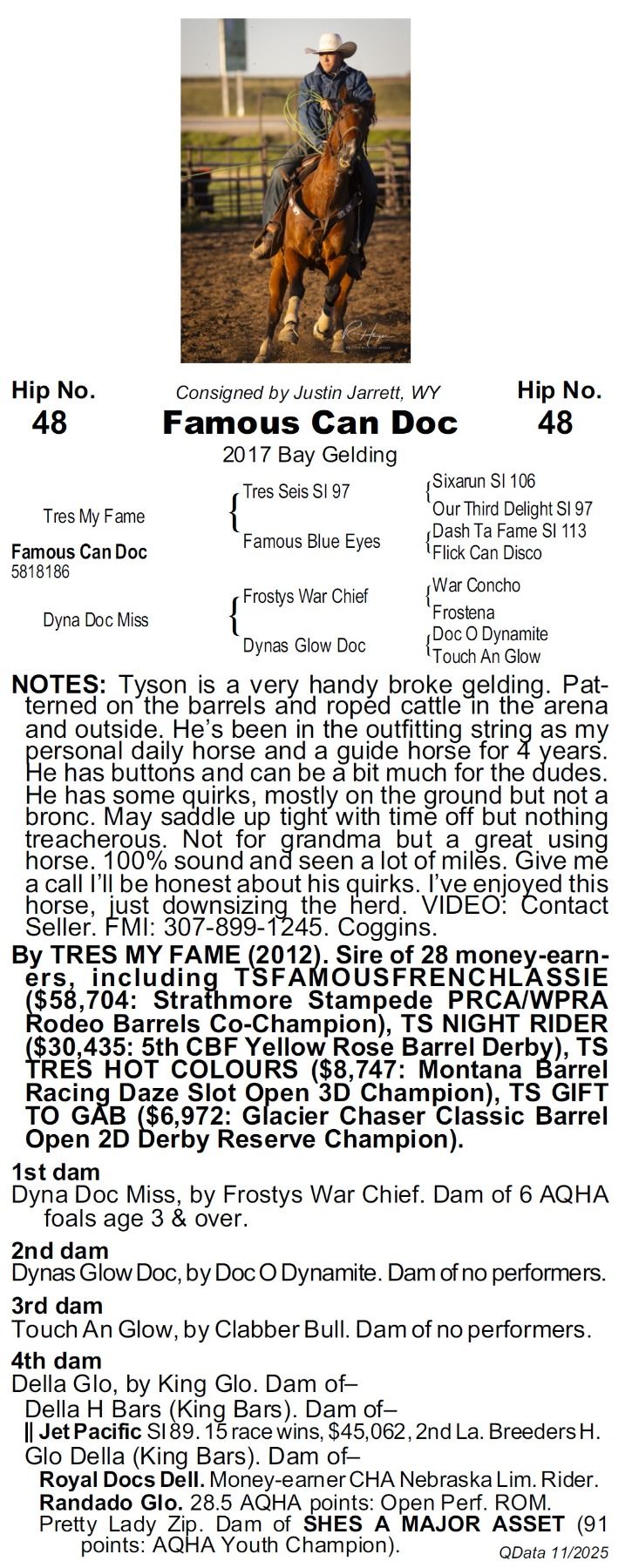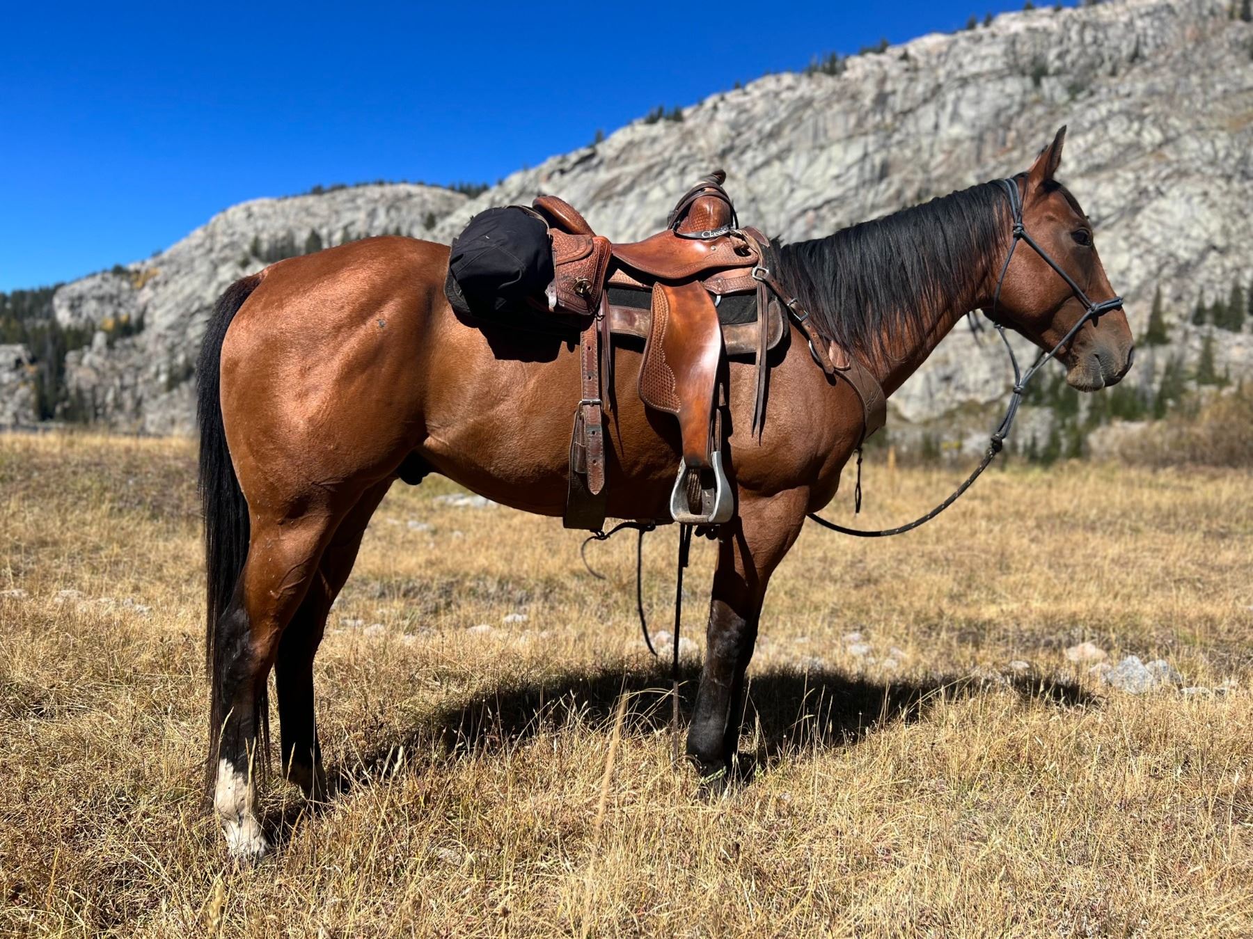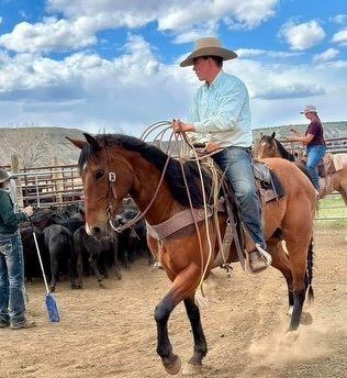 2017 AQHA Bay Gelding x Tres My Fame x Tres Seis out of Dyna Doc Miss x Frostys War Chief. Tyson is a very handy broke gelding. Patterned on the barrels and roped cattle in the arena and outside. He's been in the outfitting string as my personal daily horse and a guide horse for 4 years. He has buttons and can be a bit much for the dudes. He has some quirks, mostly on the ground but not a bronc. May saddle up tight with time off but nothing treacherous. Not for grandma but a great using horse. Take him and finish him in the arena.100% sound and seen a lot of miles. Give me a call I'll be honest about his quirks. I've enjoyed this horse, just downsizing the herd. VIDEO: Contact Seller. FMI: 307-899-1245. Coggins.