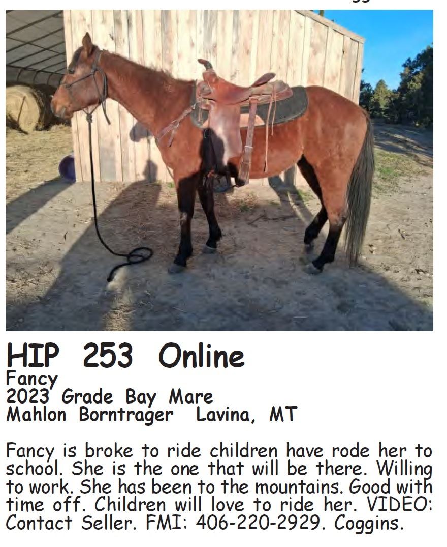 Fancy - 2023 Grade Bay Mare - Mahlon Borntrager, Lavina, MT - Fancy is broke to ride children have rode her to school. She is the one that will be there. Willing to work. She has been to the mountains. Good with time off. Children will love to ride her. VIDEO: Contact Seller. FMI: 406-220-2929. Coggins.