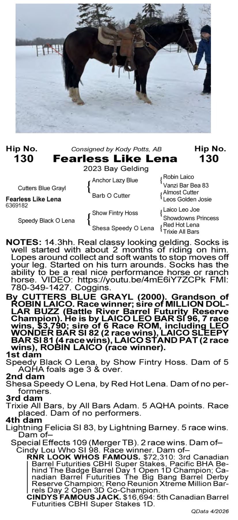 Fearless Like Lena -6369182 - 2023 AQHA Bay Gelding - Kody Potts, Barrhead, AB; Canada - 14.3hh. Real classy looking gelding. Socks is well started with about 2 months of riding on him. Lopes around collect and soft wants to stop moves off your leg. Started on his turn arounds. Socks has the ability to be a real nice performance horse or ranch horse. VIDEO: https://youtu.be/4mE6iY7ZCPk FMI: 780-349-1427. Coggins.
