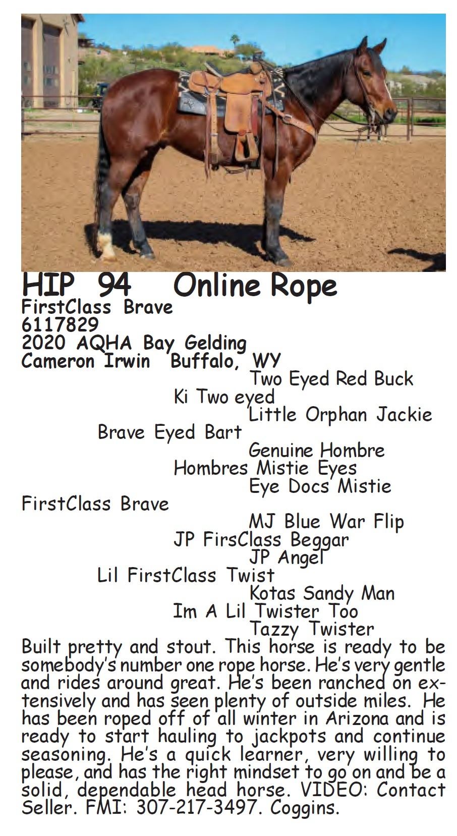 FirstClass Brave - 6117829 - 2020 AQHA Bay Gelding - Cameron Irwin, Buffalo, WY - Built pretty and stout. This horse is ready to be somebody’s number one rope horse. He’s very gentle and rides around great. He’s been ranched on extensively and has seen plenty of outside miles. He has been roped off of all winter in Arizona and is ready to start hauling to jackpots and continue seasoning. He’s a quick learner, very willing to please, and has the right mindset to go on and be a solid, dependable head horse. VIDEO: Contact Seller. FMI: 307-217-3497. Coggins.