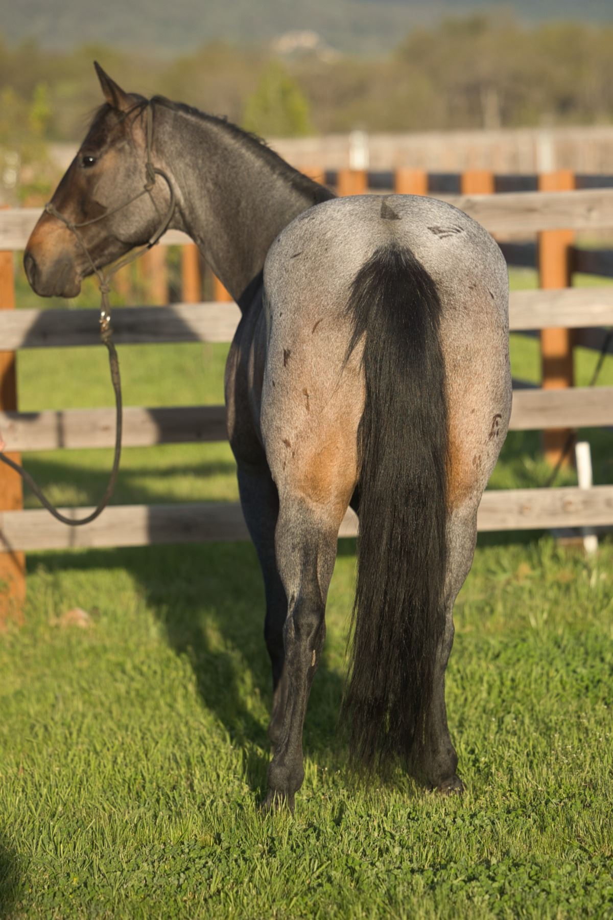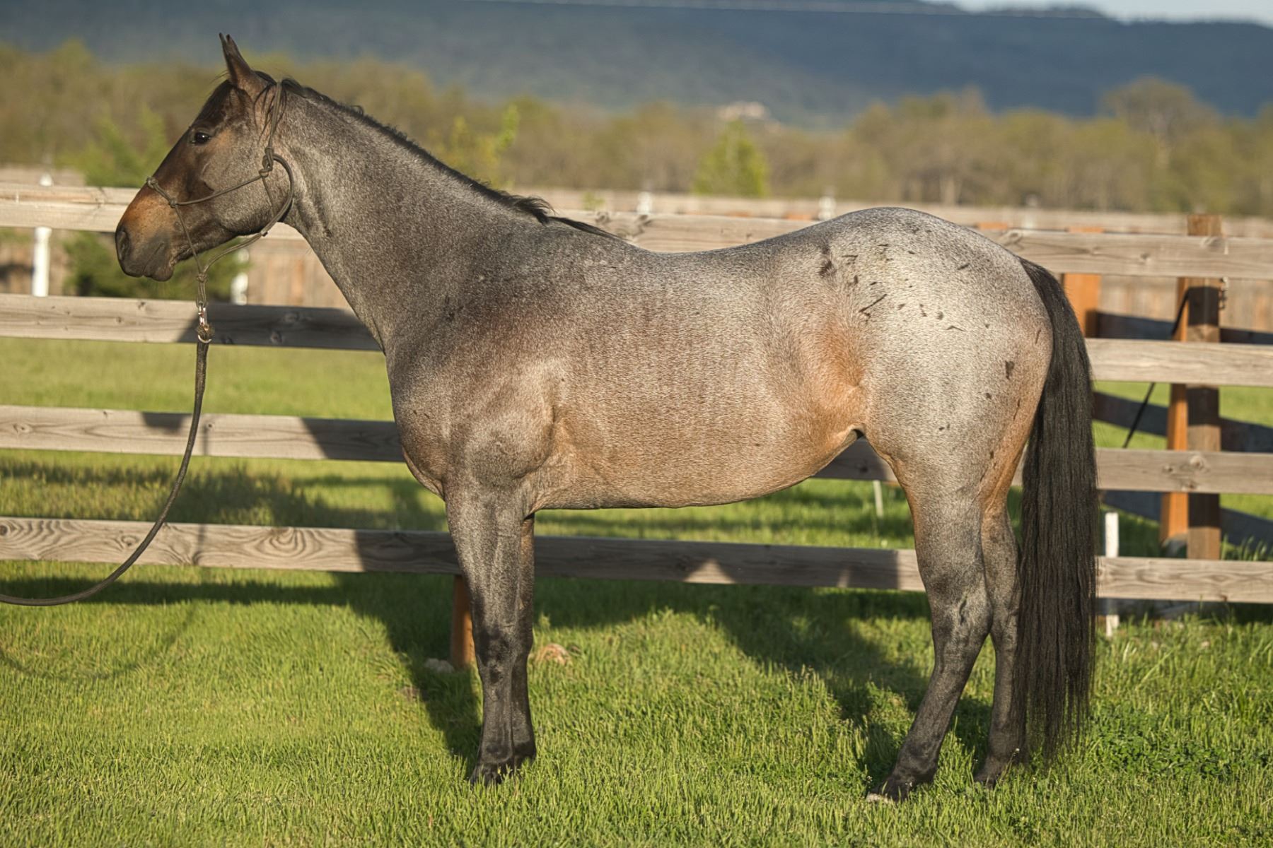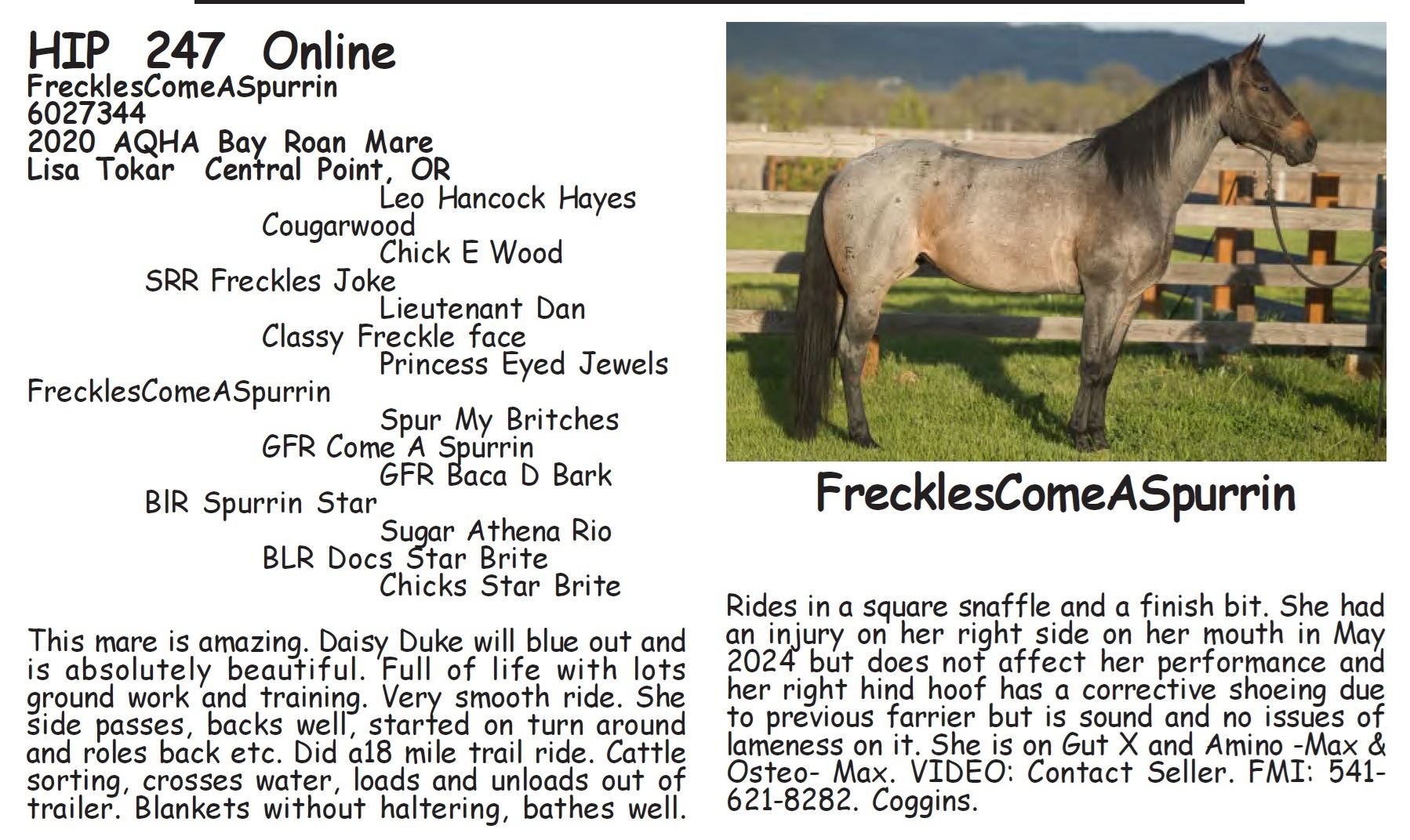 FrecklesComeASpurrin - 6027344 - 2020 AQHA Bay Roan Mare - Lisa Tokar, Central Point, OR - This mare is amazing. Daisy Duke will blue out and is absolutely beautiful. Full of life with lots ground work and training. Very smooth ride. She side passes, backs well, started on turn around and roles back etc. Did a18 mile trail ride. Cattle sorting, crosses water, loads and unloads out of trailer. Blankets without haltering, bathes well. Rides in a square snaffle and a finish bit. She had an injury on her right side on her mouth in May 2024 but does not affect her performance and her right hind hoof has a corrective shoeing due to previous farrier but is sound and no issues of lameness on it. She is on Gut X and Amino -Max & Osteo- Max. VIDEO: Contact Seller. FMI: 541-621-8282. Coggins.