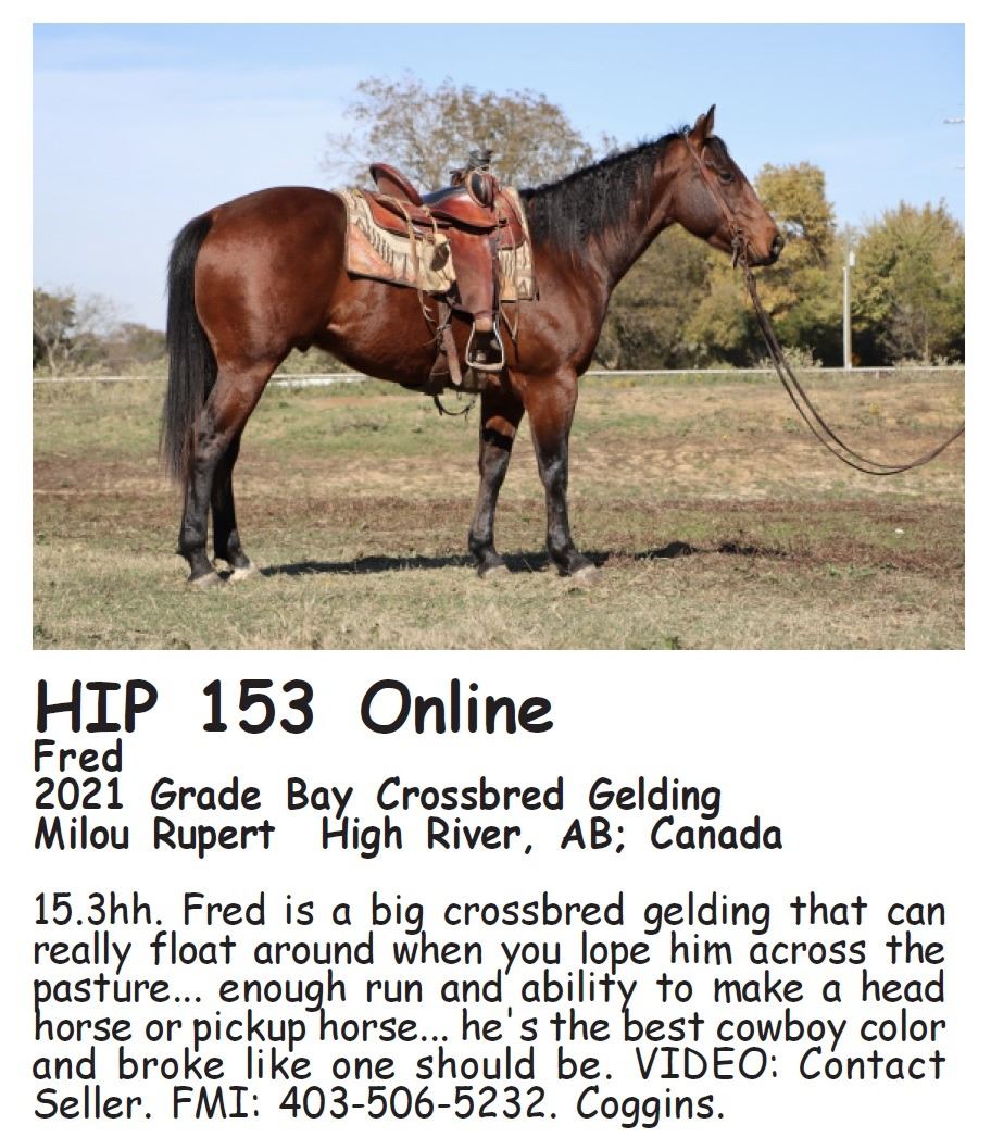 15.3hh. Fred is a big crossbred gelding that can really float around when you lope him across the pasture... enough run and ability to make a head horse or pickup horse... he's the best cowboy color and broke like one should be. VIDEO: Contact Seller. FMI: 403-506-5232. Coggins