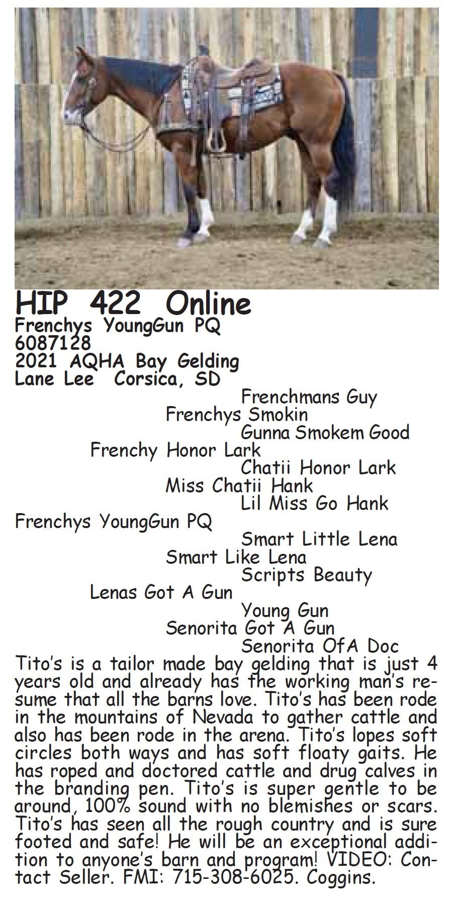 Tito’s is a tailor made bay gelding that is just 4 years old and already has the working man’s resume that all the barns love. Tito’s has been rode in the mountains of Nevada to gather cattle and also has been rode in the arena. Tito’s lopes soft circles both ways and has soft floaty gaits. He has roped and doctored cattle and drug calves in the branding pen. Tito’s is super gentle to be around, 100% sound with no blemishes or scars. Tito’s has seen all the rough country and is sure footed and safe! He will be an exceptional addition to anyone’s barn and program! VIDEO: Contact Seller. FMI: 715-308-6025. Coggins.
