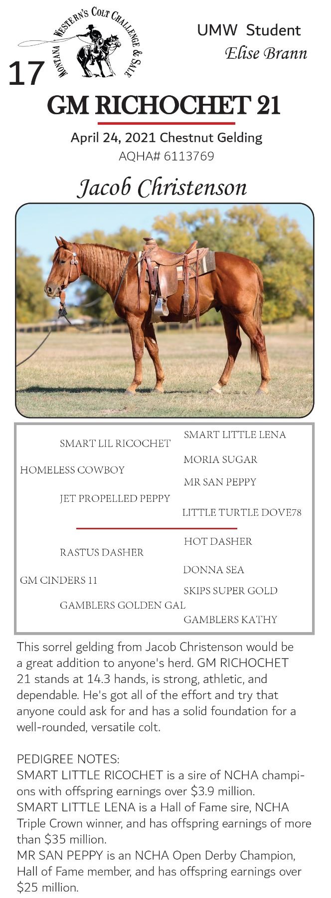 This sorrel gelding from Jacob Christenson would be a great addition to anyone's herd. GM Richochet 21 stands at 14.3 hands, is strong, athletic, and dependable. He's got all of the effort and try that anyone could ask for and has a solid foundation for a well-rounded, versatile colt.