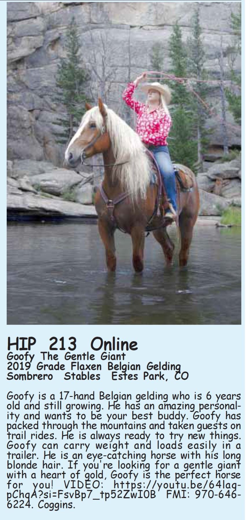 Goofy is a 17-hand Belgian gelding who is 6 years old and still growing. He has an amazing personality and wants to be your best buddy. Goofy has packed through the mountains and taken guests on trail rides. He is always ready to try new things. Goofy can carry weight and loads easily in a trailer. He is an eye-catching horse with his long blonde hair. If you're looking for a gentle giant with a heart of gold, Goofy is the perfect horse for you! VIDEO: https://youtu.be/64laq-pChqA?si=FsvBp7_tp52ZwI0B FMI: 970-646-6224. Coggins.