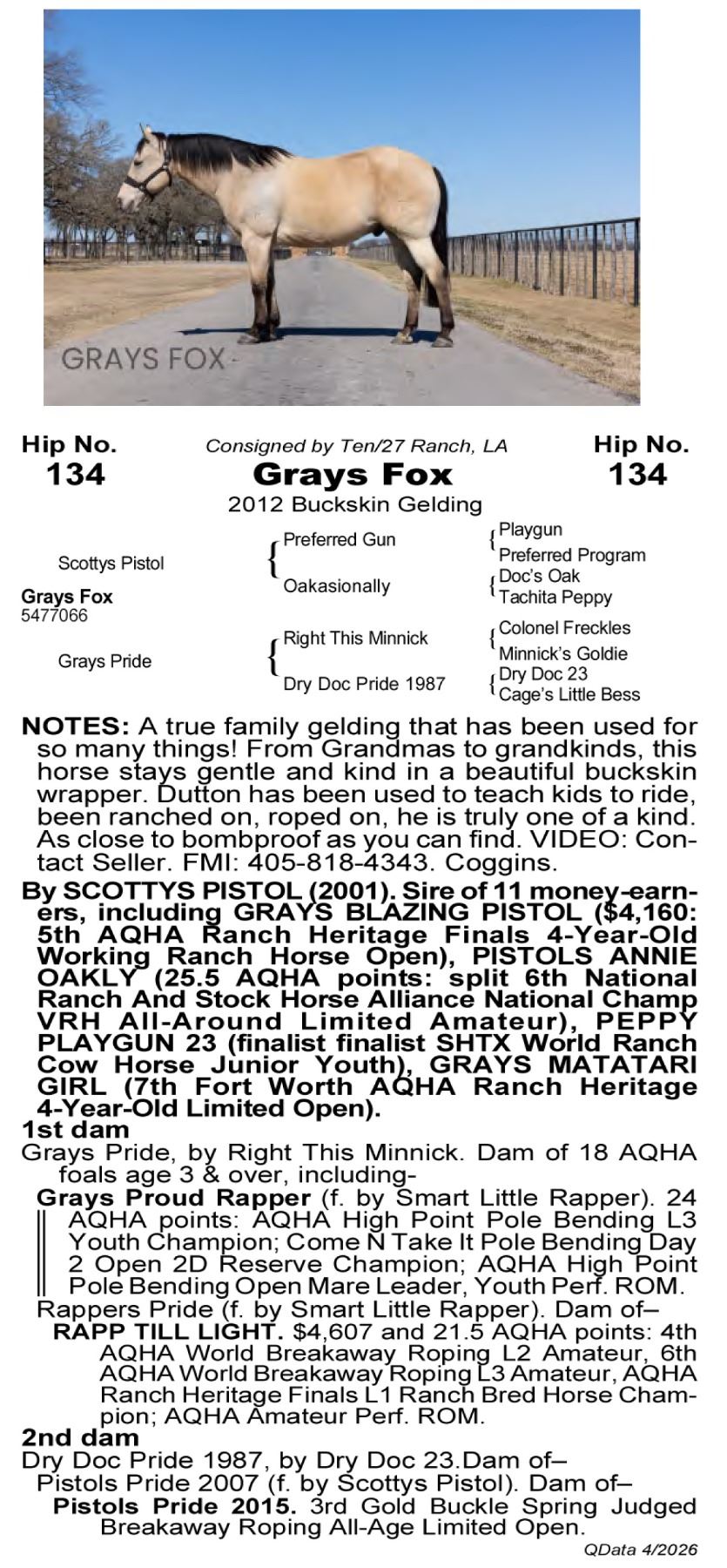 Grays Fox - 5477066 - 2012 AQHA Buckskin Gelding - Ten/27 Ranch, Denham springs, LA - A true family gelding that has been used for so many things! From Grandmas to grandkinds, this horse stays gentle and kind in a beautiful buckskin wrapper. Dutton has been used to teach kids to ride, been ranched on, roped on, he is truly one of a kind. As close to bombproof as you can find. VIDEO: Contact Seller. FMI: 405-818-4343. Coggins.
