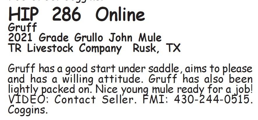 Gruff - 2021 Grade Grullo John Mule - TR Livestock Company, Rusk, TX - Gruff has a good start under saddle, aims to please and has a willing attitude. Gruff has also been lightly packed on. Nice young mule ready for a job! VIDEO: Contact Seller. FMI: 430-244-0515. Coggins.