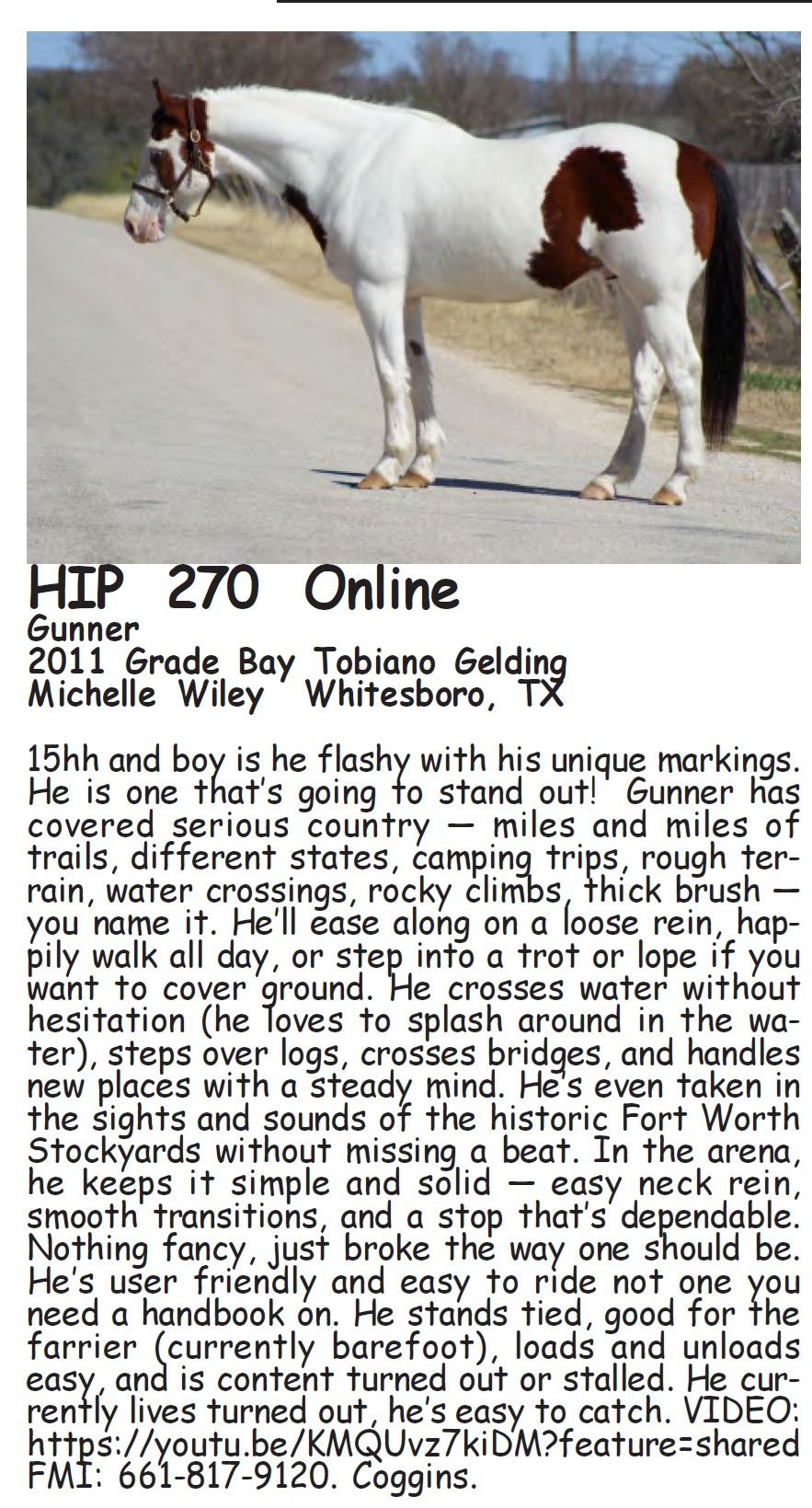 Gunner - 2011 Grade Bay Tobiano Gelding - Michelle Wiley, Whitesboro, TX - 15hh and boy is he flashy with his unique markings. He is one that’s going to stand out! Gunner has covered serious country — miles and miles of trails, different states, camping trips, rough terrain, water crossings, rocky climbs, thick brush — you name it. He’ll ease along on a loose rein, happily walk all day, or step into a trot or lope if you want to cover ground. He crosses water without hesitation (he loves to splash around in the water), steps over logs, crosses bridges, and handles new places with a steady mind. He’s even taken in the sights and sounds of the historic Fort Worth Stockyards without missing a beat. In the arena, he keeps it simple and solid — easy neck rein, smooth transitions, and a stop that’s dependable. Nothing fancy, just broke the way one should be. He’s user friendly and easy to ride not one you need a handbook on. He stands tied, good for the farrier (currently barefoot), loads and unloads easy, and is content turned out or stalled. He currently lives turned out, he’s easy to catch. VIDEO: https://youtu.be/KMQUvz7kiDM?feature=shared FMI: 661-817-9120. Coggins.