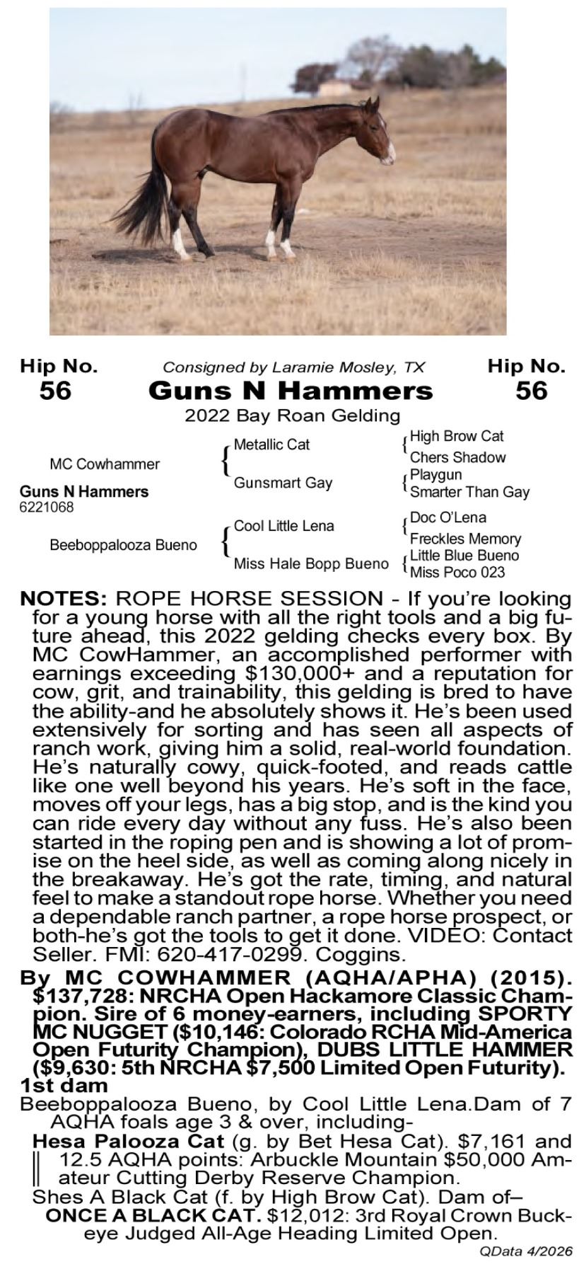 Guns N Hammers - 6221068 - 2022 AQHA Bay Roan Gelding - Laramie Mosley, Tennessee Colony, TX - If you’re looking for a young horse with all the right tools and a big future ahead, this 2022 gelding checks every box. By Mc CowHammer, an accomplished performer with earnings exceeding $30,000+ and a reputation for cow, grit, and trainability, this gelding is bred to have the ability—and he absolutely shows it. He’s been used extensively for sorting and has seen all aspects of ranch work, giving him a solid, real-world foundation. He’s naturally cowy, quick-footed, and reads cattle like one well beyond his years. The more you use him, the better he gets. What really sets him apart is how broke and user-friendly he is for his age. He’s soft in the face, moves off your legs, has a big stop, and is the kind you can ride every day without any fuss. Super easy, willing, and consistent. He’s also been started in the roping pen and is showing a lot of promise on the heel side, as well as coming along nicely in the breakaway. He’s got the rate, timing, and natural feel to make a standout rope horse. This is a talented, well-rounded young gelding with the mind, ability, and experience to go any direction you want. Whether you need a dependable ranch partner, a rope horse prospect, or both—he’s got the tools to get it done. VIDEO: Contact Seller. FMI: 620-417-0299. Coggins.