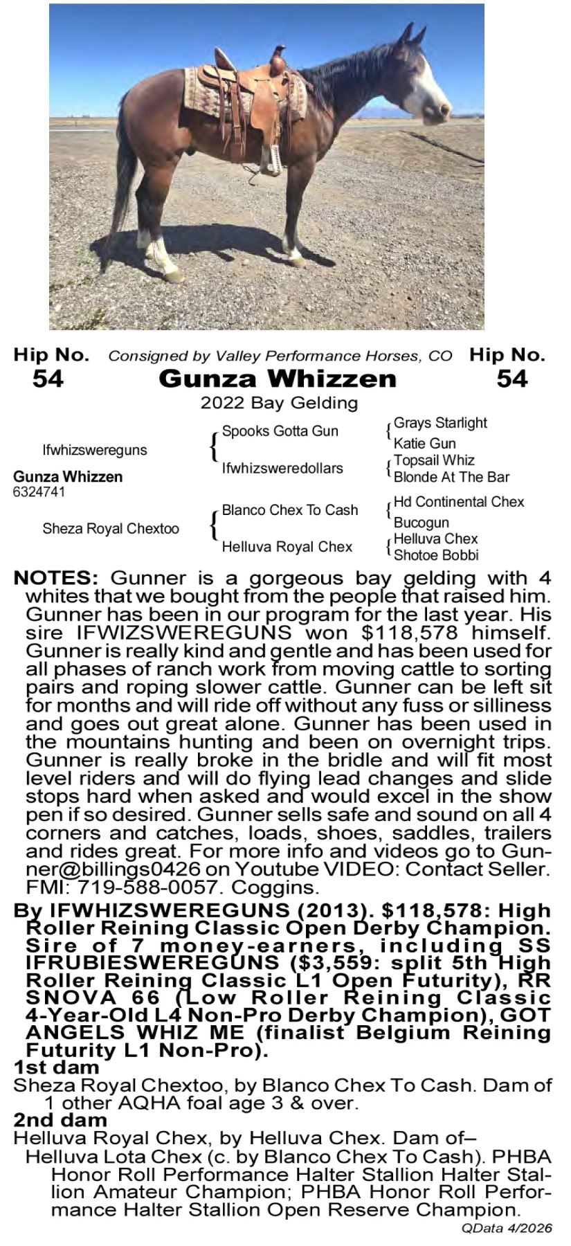 Gunza Whizzen -6324741 - 2022 AQHA Bay Gelding - Valley Performance Horses, Sanford, CO - 15hh. Gunner is a gorgeous bay gelding with 4 whites that we bought from the people that raised him. Gunner has been in our program for the last year. His sire IFWIZSWEREGUNS won $118,636.00 himself. Gunner is really kind and gentle and has been used for all phases of ranch work from moving cattle to sorting pairs and roping slower cattle. Gunner can be left sit for months and will ride off without any fuss or silliness and goes out great alone. Gunner has been used in the mountains hunting and been on overnight trips. Gunner is really broke in the bridle and will fit most level riders and will do flying lead changes and slide stops hard when asked and would excel in the show pen if so desired. Gunner sells safe and sound on all 4 corners and catches, loads, shoes, saddles, trailers and rides great, if you want a mount that stands out in the crowd and look good doing it you don't want to miss him. For more info and videos go to Gunner@billings0426 on Youtube VIDEO: Contact Seller. FMI: 719-588-0057. Coggins.