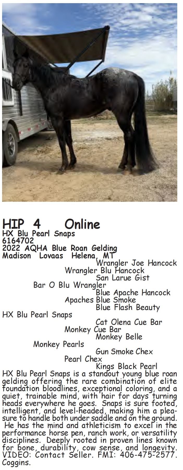 HX Blu Pearl Snaps - 6164702 - 2022 AQHA Blue Roan Gelding - Madison Lovaas, Helena, MT - HX Blu Pearl Snaps is a standout young blue roan gelding offering the rare combination of elite foundation bloodlines, exceptional coloring, and a quiet, trainable mind, with hair for days turning heads everywhere he goes. Snaps is sure footed, intelligent, and level-headed, making him a pleasure to handle both under saddle and on the ground. He has the mind and athleticism to excel in the performance horse pen, ranch work, or versatility disciplines. Deeply rooted in proven lines known for bone, durability, cow sense, and longevity. VIDEO: Contact Seller. FMI: 406-475-2577. Coggins.