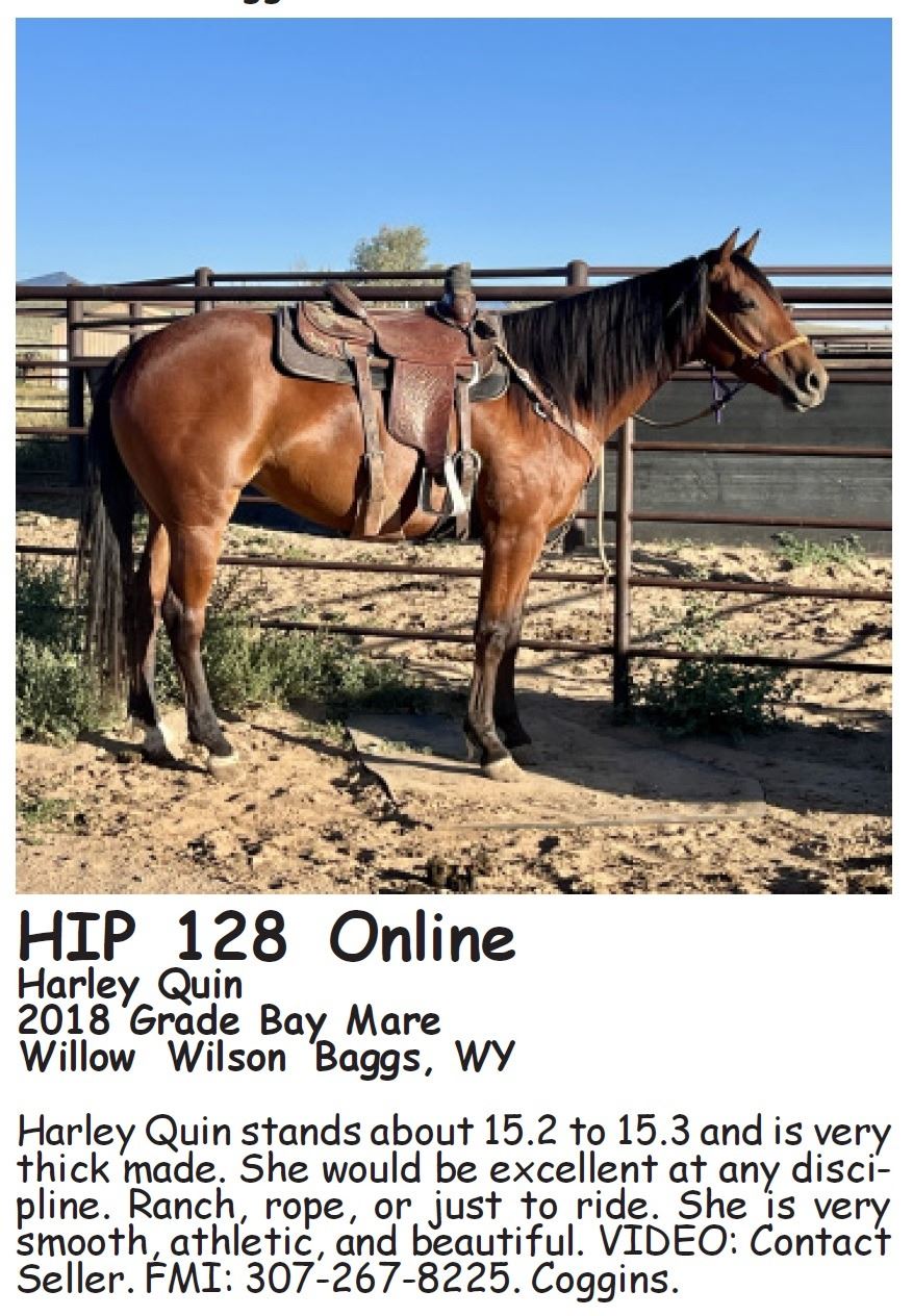 Harley Quin stands about 15.2 to 15.3 and is very thick made. She would be excellent at any discipline. Ranch, rope, or just to ride. She is very smooth, athletic, and beautiful. VIDEO: Contact Seller. FMI: 307-267-8225. Coggins.