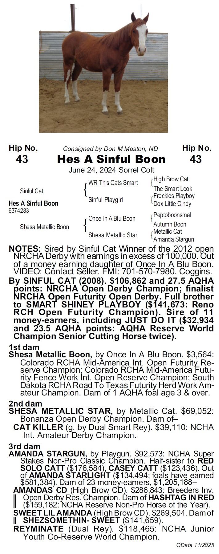 2024 AQHA Sorrel Stallion x Sinful Cat x WR This Cats Smart out of Shesa Metallic Boon x Once In A Blu Boon. Sired by Sinful Cat Winner of the 2012 open NRCHA Derby with earnings in excess of 100,000. Out of a money earning daughter of Once In A Blu Boon. VIDEO: Contact Seller. FMI: 701-570-7980. Coggins.