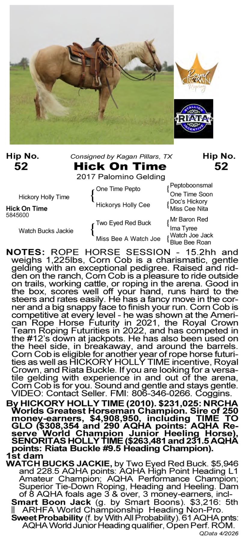 Hick On Time - 5845600 - 2017 AQHA Palomino Gelding - Kagan Pillars, Canyon, TX - 15.2hh and weighs 1225lbs Corn Cob is a charismatic, gentle gelding with an exceptional pedigree.. Raised and ridden on the ranch, Corn Cob is a pleasure to ride outside on trails, working cattle, or roping in the arena. Good in the box, scores well off your hand, runs hard to the steers and rates easily. He has a fancy move in the corner and a big snappy face to finish your run. Corn Cob is competitive at every level - he was shown at the American Rope Horse Futurity in 2021, the Royal Crown Team Roping Futurities in 2022, and has competed in the #12s down at jackpots. He has also been used on the heel side, in breakaway, and around the barrels. Corn Cob is eligible for another year of rope horse futurities as well as HICKORY HOLLY TIME incentive, Royal Crown, and Riata Buckle. If you are looking for a versatile gelding with experience in and out of the arena, Corn Cob is for you. Sound and gentle and stays gentle. VIDEO: Contact Seller. FMI: 806-346-0266. Coggins.