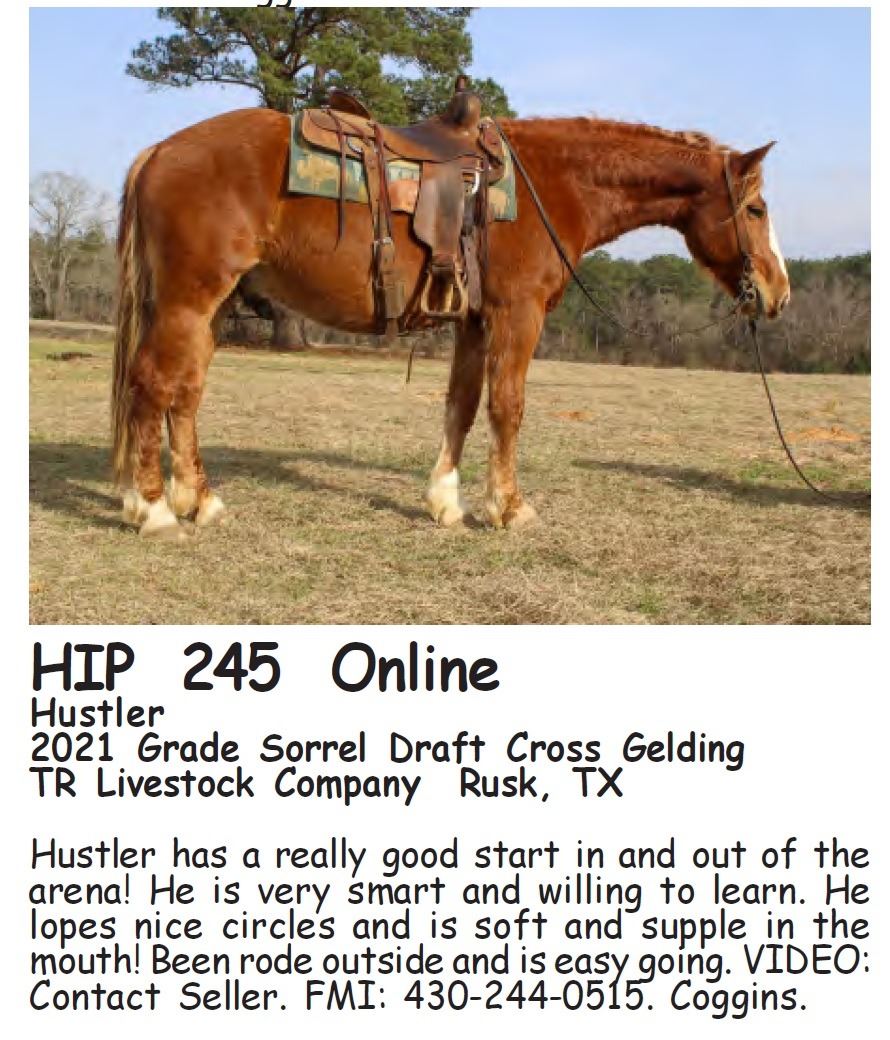 Hustler - 2021 Grade Sorrel Draft Cross Gelding - TR Livestock Company, Rusk, TX - Hustler has a really good start in and out of the arena! He is very smart and willing to learn. He lopes nice circles and is soft and supple in the mouth! Been rode outside and is easy going. VIDEO: Contact Seller. FMI: 430-244-0515. Coggins.