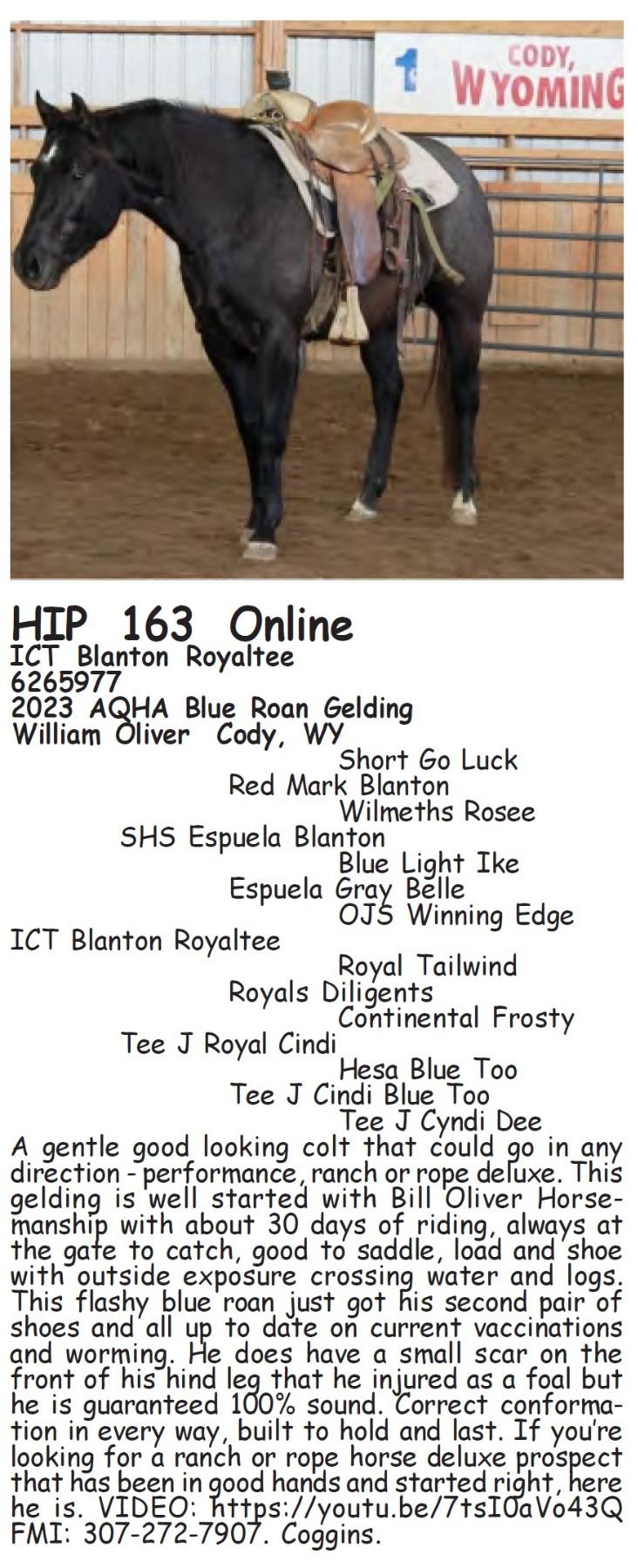 ICT Blanton Royaltee - 6265977 - 2023 AQHA Blue Roan Gelding - William Oliver, Cody, WY - A gentle good looking colt that could go in any direction - performance, ranch or rope deluxe. This gelding is well started with Bill Oliver Horsemanship with about 30 days of riding, always at the gate to catch, good to saddle, load and shoe with outside exposure crossing water and logs. This flashy blue roan just got his second pair of shoes and all up to date on current vaccinations and worming. He does have a small scar on the front of his hind leg that he injured as a foal but he is guaranteed 100% sound. Correct conformation in every way, built to hold and last. If you’re looking for a ranch or rope horse deluxe prospect that has been in good hands and started right, here he is. VIDEO: https://youtu.be/7tsI0aVo43Q FMI: 307-272-7907. Coggins.
