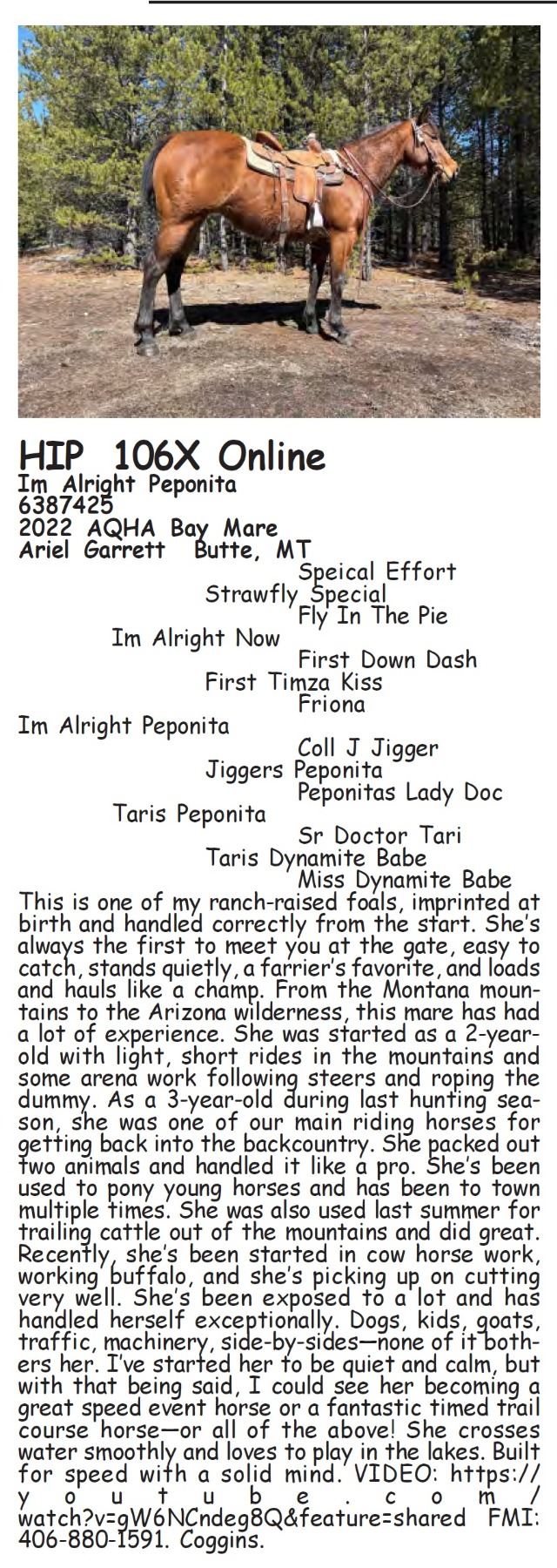Im Alright Peponita - 6387425 - 2022 AQHA Bay Mare - Ariel Garrett, Butte, MT - This is one of my ranch-raised foals, imprinted at birth and handled correctly from the start. She’s always the first to meet you at the gate, easy to catch, stands quietly, a farrier’s favorite, and loads and hauls like a champ. From the Montana mountains to the Arizona wilderness, this mare has had a lot of experience. She was started as a 2-year-old with light, short rides in the mountains and some arena work following steers and roping the dummy. As a 3-year-old during last hunting season, she was one of our main riding horses for getting back into the backcountry. She packed out two animals and handled it like a pro. She’s been used to pony young horses and has been to town multiple times. She was also used last summer for trailing cattle out of the mountains and did great. Recently, she’s been started in cow horse work, working buffalo, and she’s picking up on cutting very well. She’s been exposed to a lot and has handled herself exceptionally. Dogs, kids, goats, traffic, machinery, side-by-sides—none of it bothers her. I’ve started her to be quiet and calm, but with that being said, I could see her becoming a great speed event horse or a fantastic timed trail course horse—or all of the above! She crosses water smoothly and loves to play in the lakes. Built for speed with a solid mind. VIDEO: https://youtube.com/watch?v=gW6NCndeg8Q&feature=shared FMI: 406-880-1591. Coggins.