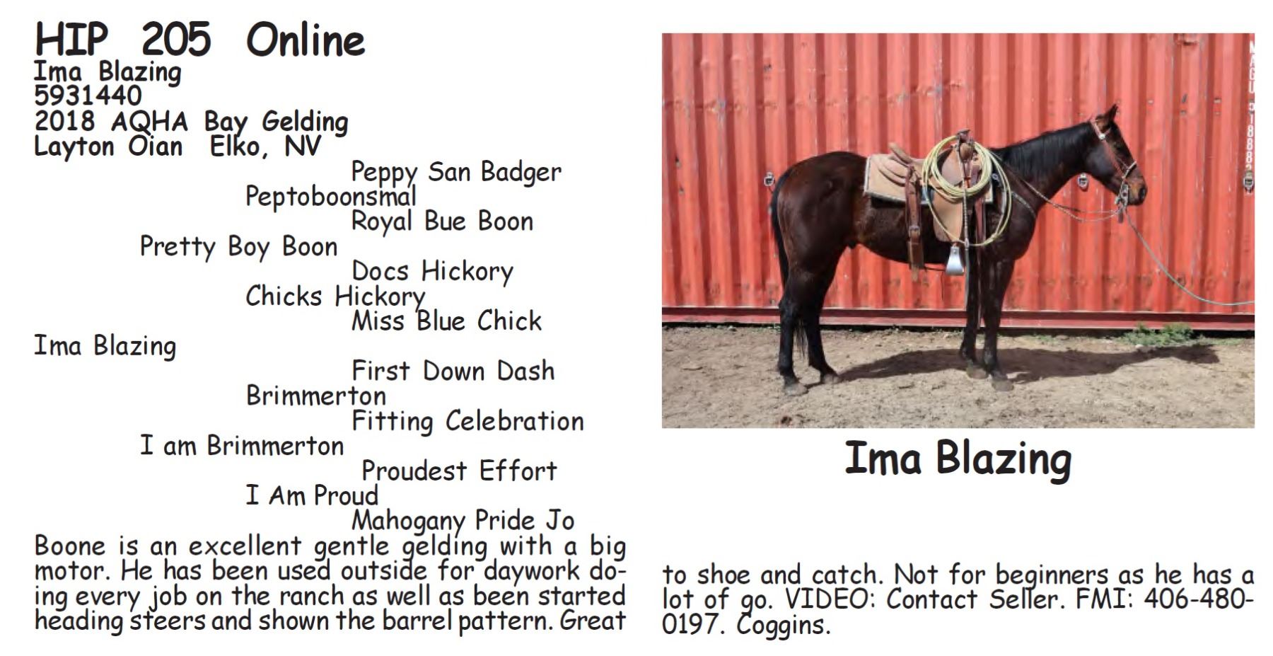 Ima Blazing - 5931440 - 2018 AQHA Bay Gelding - Layton Oian, Elko, NV - Boone is an excellent gentle gelding with a big motor. He has been used outside for daywork doing every job on the ranch as well as been started heading steers and shown the barrel pattern. Great to shoe and catch. Not for beginners as he has a lot of go. VIDEO: Contact Seller. FMI: 406-480-0197. Coggins.