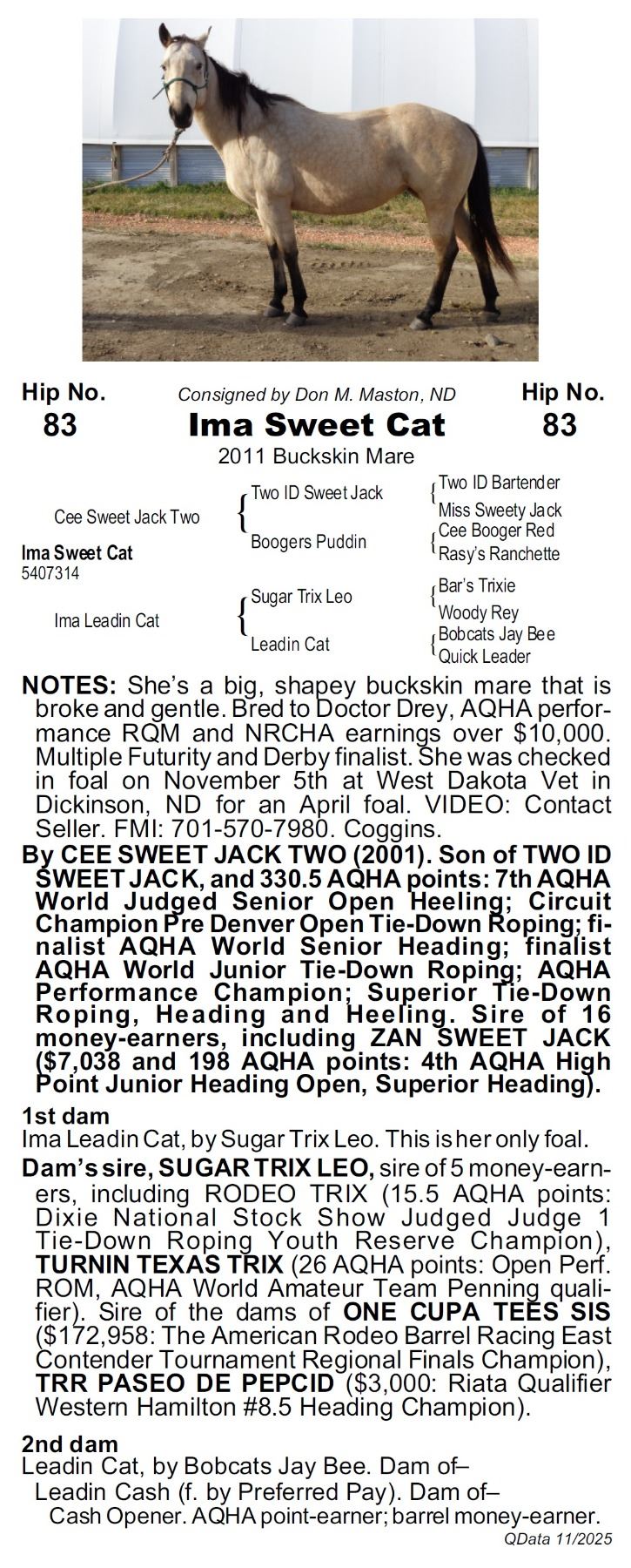 2011 AQHA Buckskin Mare x Cee Sweet Jack Two x Two ID Sweet Jack out of Ima Leadin Cat x Sugar Trix Leo. She's a big, shapey buckskin mare that is broke and gentle. Bred to Doctor Drey, AQHA performance RQM and NRCHA earnings over $10,000. Multiple Futurity and Derby finalist. She was checked in foal on November 5th at West Dakota Vet in Dickinson, ND for an April foal. VIDEO: Contact Seller. FMI: 701-570-7980. Coggins.