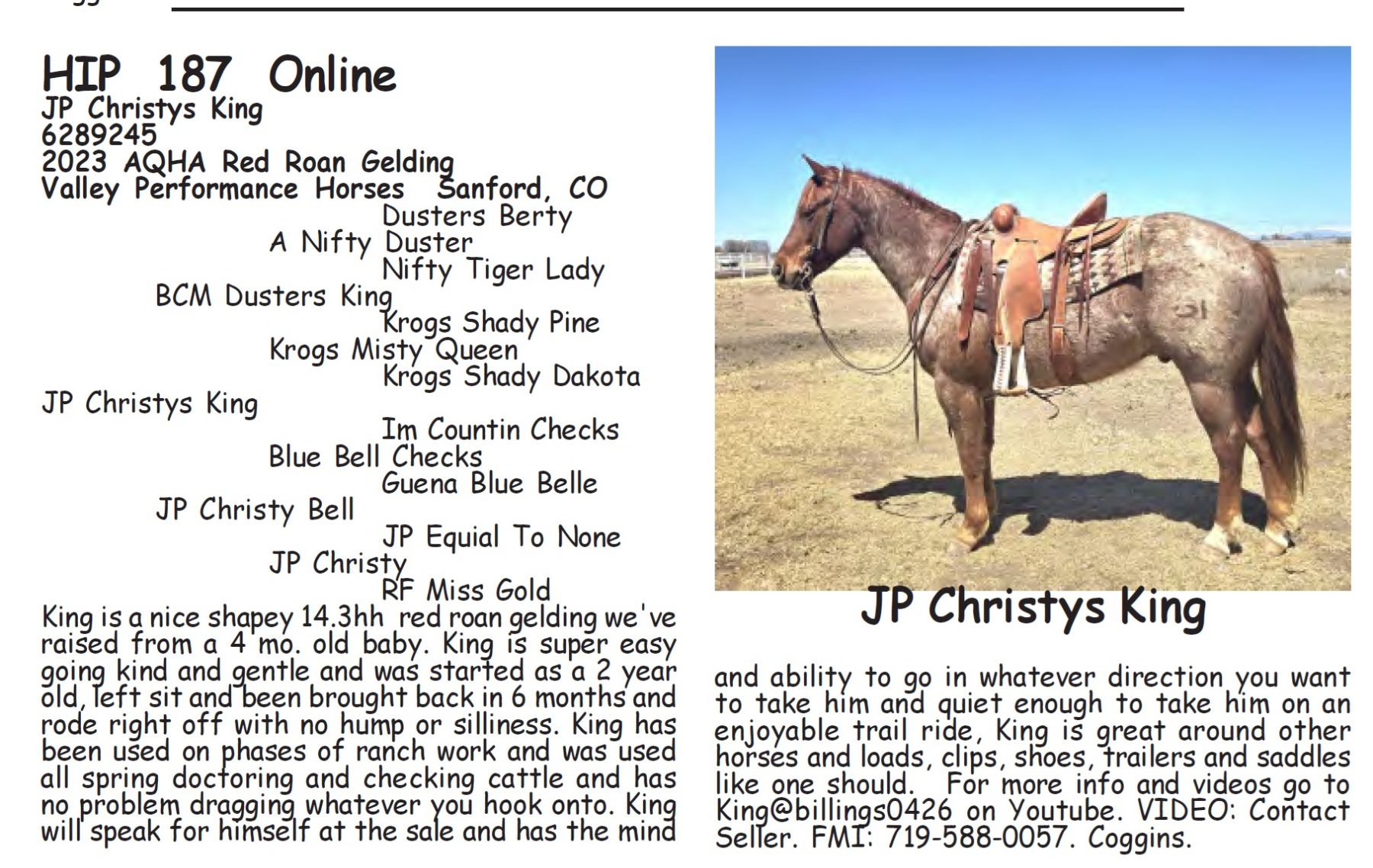 JP Christys King - 6289245 - 2023 AQHA Red Roan Gelding - Valley Performance Horses, Sanford, CO - King is a nice shapey 14.3hh red roan gelding we've raised from a 4 mo. old baby. King is super easy going kind and gentle and was started as a 2 year old, left sit and been brought back in 6 months and rode right off with no hump or silliness. King has been used on phases of ranch work and was used all spring doctoring and checking cattle and has no problem dragging whatever you hook onto. King will speak for himself at the sale and has the mind and ability to go in whatever direction you want to take him and quiet enough to take him on an enjoyable trail ride, King is great around other horses and loads, clips, shoes, trailers and saddles like one should. For more info and videos go to King@billings0426 on Youtube. VIDEO: Contact Seller. FMI: 719-588-0057. Coggins.
