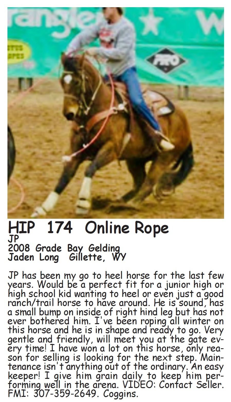 JP - 2008 Grade Bay Gelding - Jaden Long, Gillette, WY - JP has been my go to heel horse for the last few years. Would be a perfect fit for a junior high or high school kid wanting to heel or even just a good ranch/trail horse to have around. He is sound, has a small bump on inside of right hind leg but has not ever bothered him. I've been roping all winter on this horse and he is in shape and ready to go. Very gentle and friendly, will meet you at the gate every time! I have won a lot on this horse, only reason for selling is looking for the next step. Maintenance isn't anything out of the ordinary. An easy keeper! I give him grain daily to keep him performing well in the arena. VIDEO: Contact Seller. FMI: 307-359-2649. Coggins.