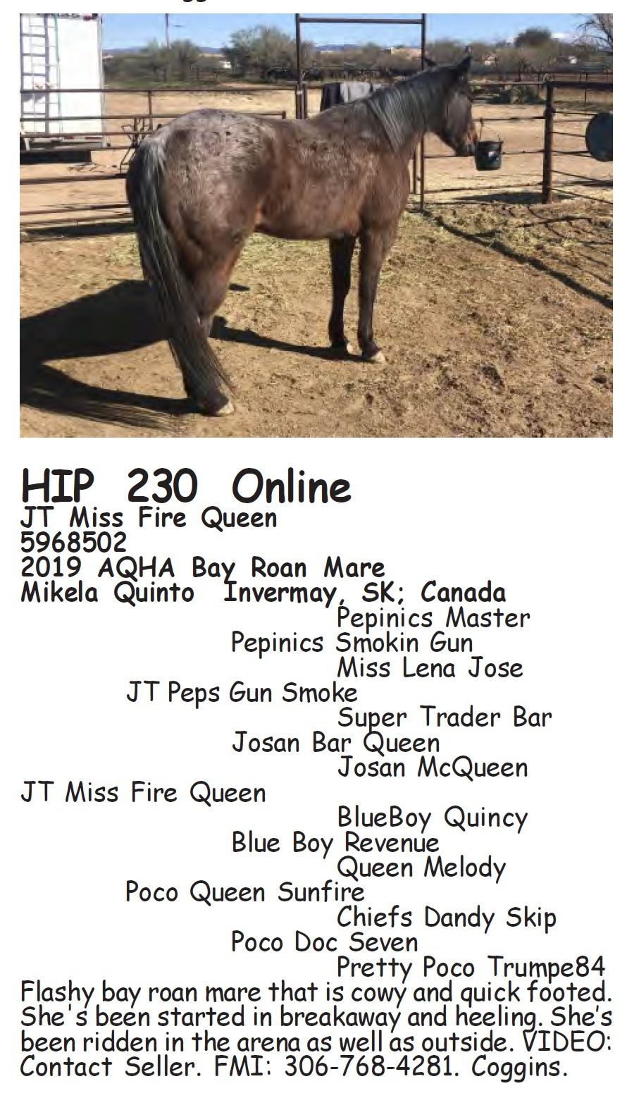 JT Miss Fire Queen - 5968502 - 2019 AQHA Bay Roan Mare - Mikela Quinto, Invermay, SK; Canada - Flashy bay roan mare that is cowy and quick footed. She's been started in breakaway and heeling. She’s been ridden in the arena as well as outside. VIDEO: Contact Seller. FMI: 306-768-4281. Coggins.