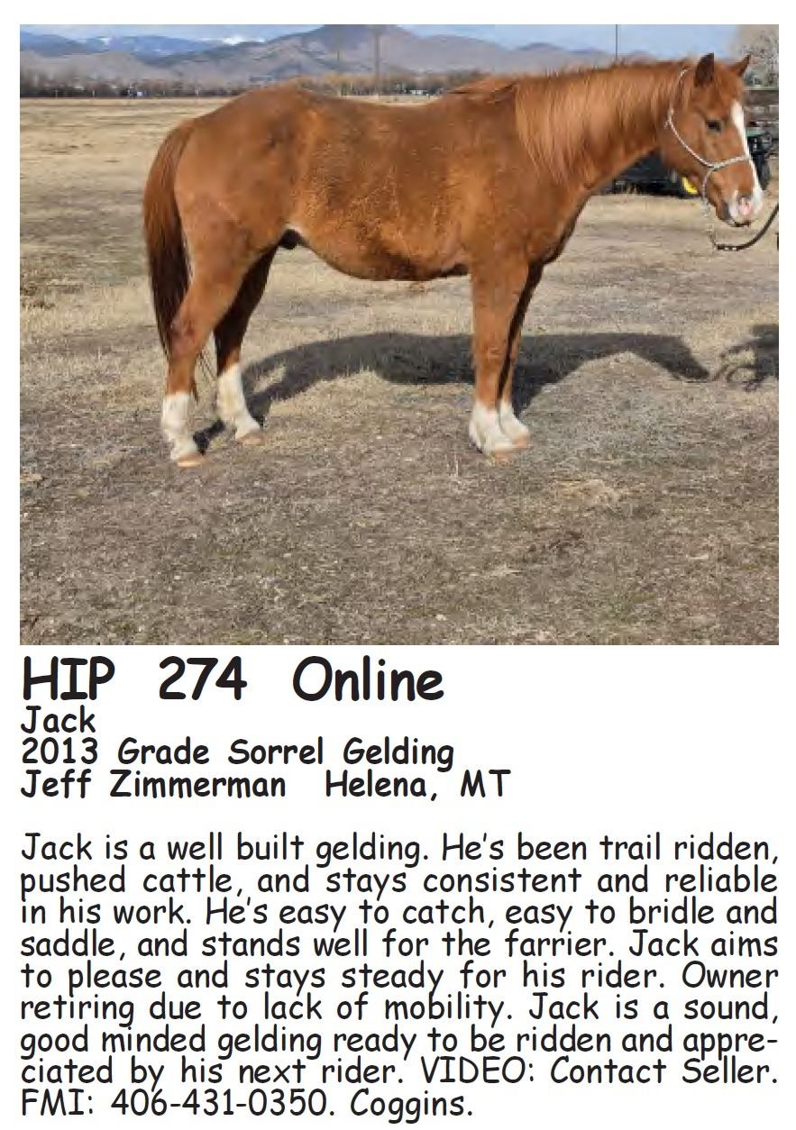 Jack - 2013 Grade Sorrel Gelding - Jeff Zimmerman, Helena, MT - Jack is a wellbuilt gelding. He’s been trailridden, pushed cattle, and stays consistent and reliable in his work. He’s easy to catch, easy to bridle and saddle, and stands well for the farrier. Jack aims to please and stays steady for his rider. Owner retiring due to lack of mobility. Jack is a sound, goodminded gelding ready to be ridden and appreciated by his next rider. VIDEO: Contact Seller. FMI: 406-431-0350. Coggins.