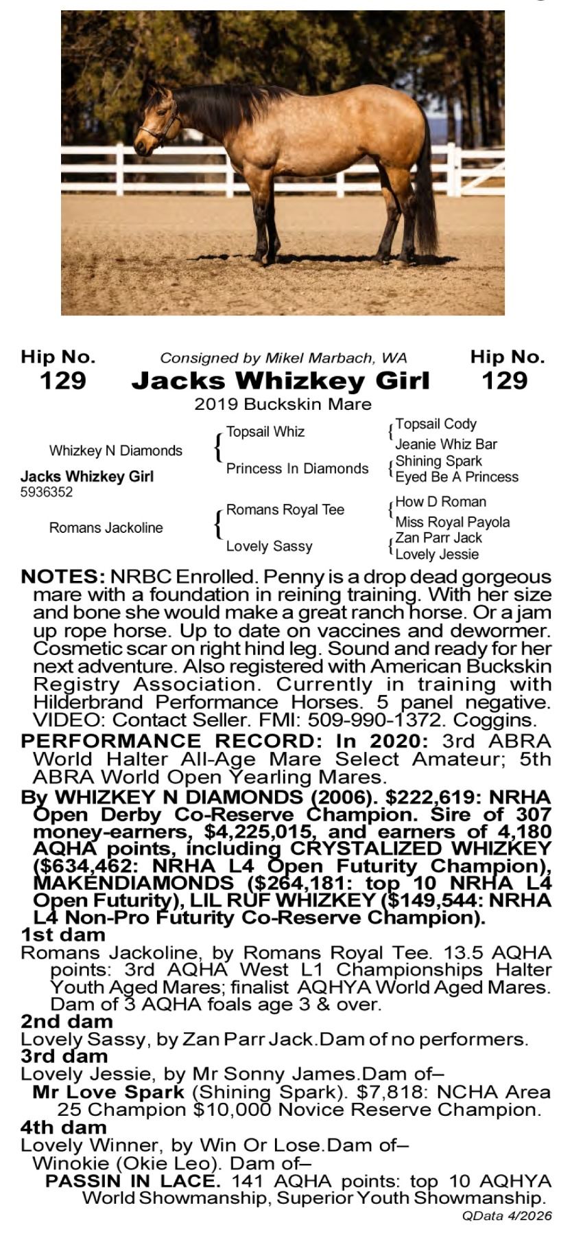 Jacks Whizkey Girl -5936352 - 2019 AQHA Buckskin Mare - Mikel Marbach, Clarkston, WA - NRBC Enrolled. Penny is a drop dead gorgeous mare with a foundation in reining training. With her size and bone she would make a great ranch horse. Or a jam up rope horse. Up to date on vaccines and dewormer. Cosmetic scar on right hind leg. Sound and ready for her next adventure. Also registered with American Buckskin Registry Association. Currently in training with Hilderbrand Performance Horses. 5 panel negative. VIDEO: Contact Seller. FMI: 509-990-1372. Coggins.