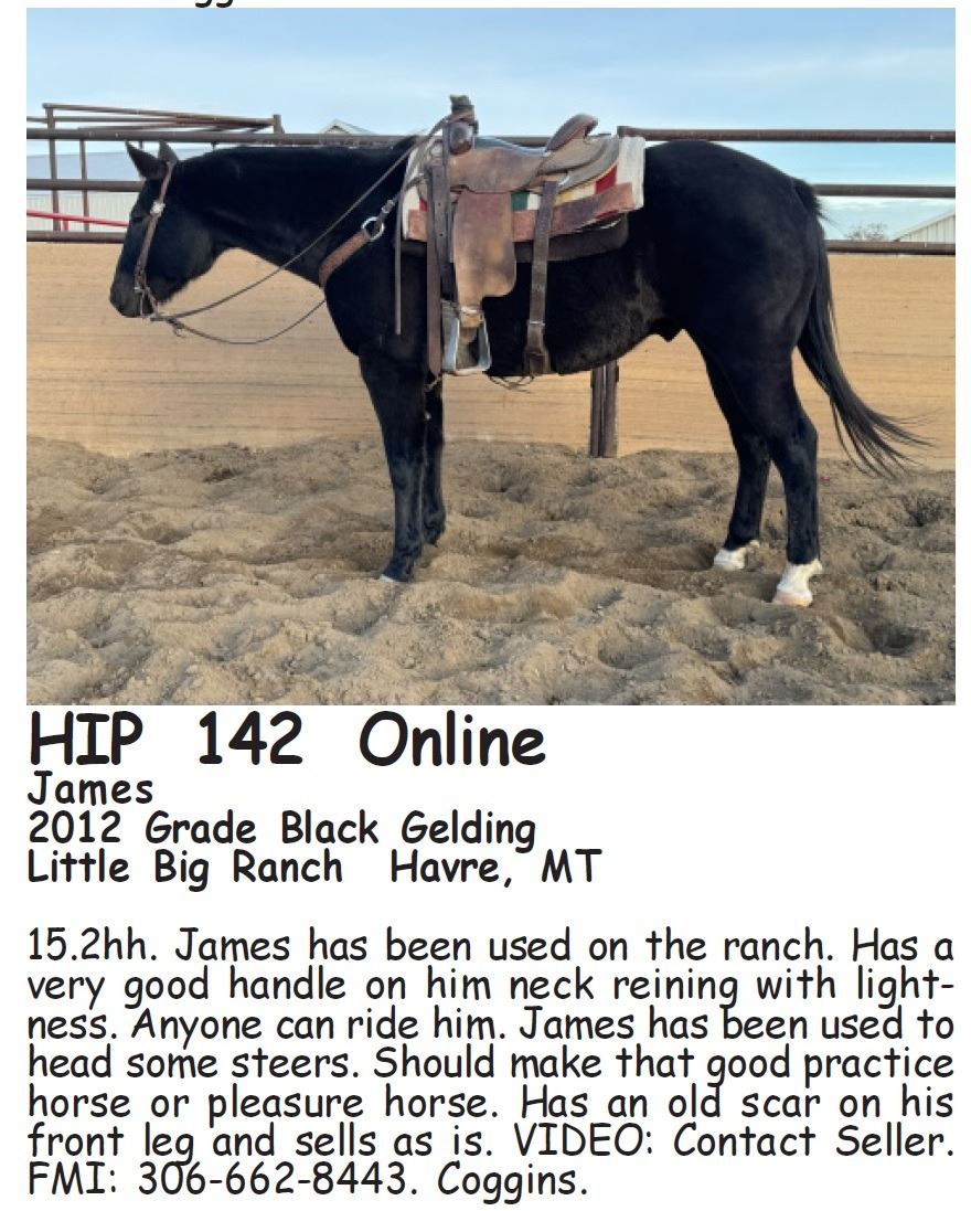 15.2hh. James has been used on the ranch. Has a very good handle on him neck reining with lightness. Anyone can ride him. James has been used to head some steers. Should make that good practice horse or pleasure horse. Has an old scar on his front leg and sells as is. VIDEO: Contact Seller. FMI: 306-662-8443. Coggins