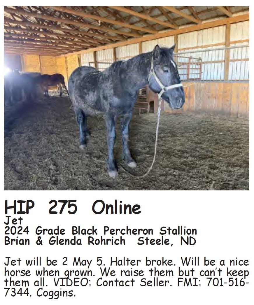 Jet - 2024 Grade Black Percheron Stallion - Brian & Glenda Rohrich, Steele, ND - Jet will be 2 May 5. Halter broke. Will be a nice horse when grown. We raise them but can’t keep them all. VIDEO: Contact Seller. FMI: 701-516-7344. Coggins.
