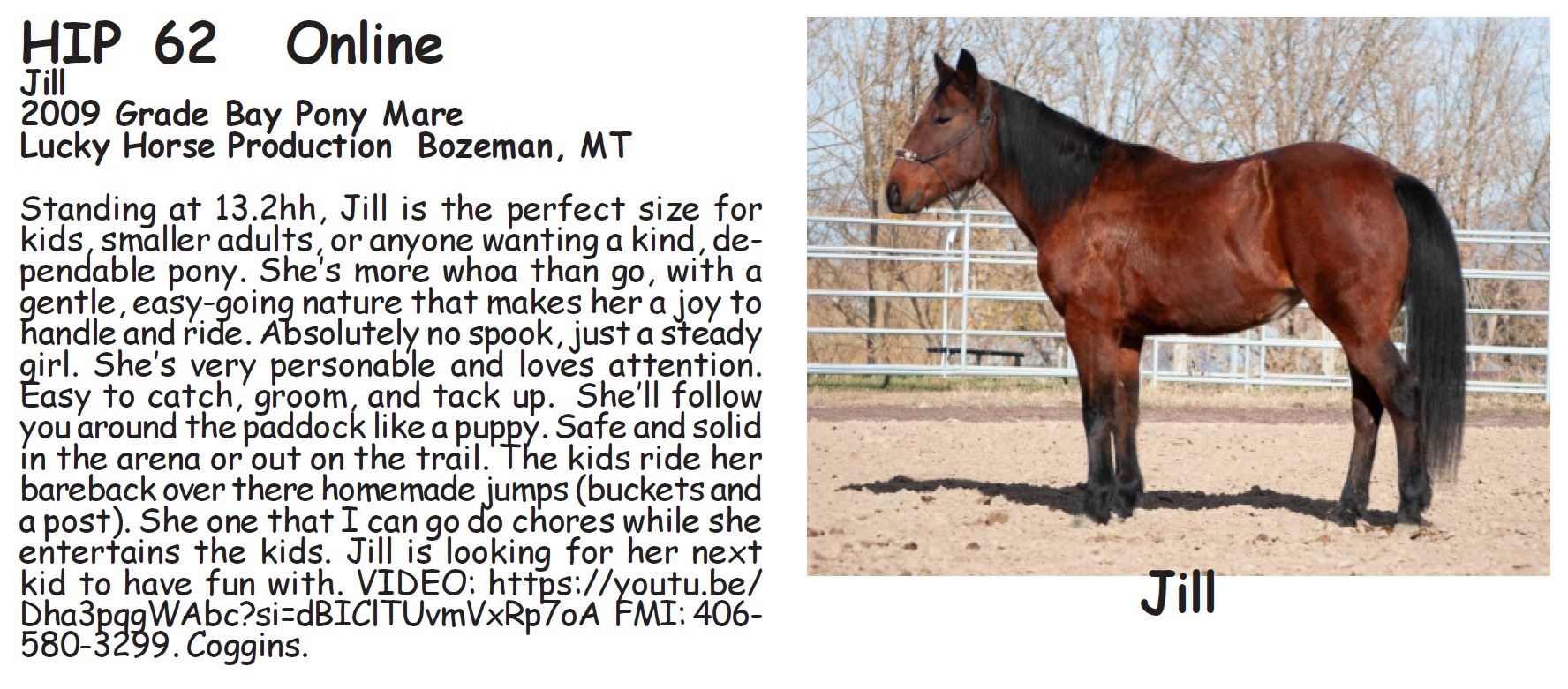 Standing at 13.2hh, Jill is the perfect size for kids, smaller adults, or anyone wanting a kind, dependable pony. She’s more whoa than go, with a gentle, easy-going nature that makes her a joy to handle and ride. Absolutely no spook, just a steady girl. She’s very personable and loves attention. Easy to catch, groom, and tack up. She’ll follow you around the paddock like a puppy. Safe and solid in the arena or out on the trail. The kids ride her bareback over there homemade jumps (buckets and a post). She one that I can go do chores while she entertains the kids. Jill is looking for her next kid to have fun with. VIDEO: https://youtu.be/Dha3pqgWAbc?si=dBIClTUvmVxRp7oA FMI: 406-580-3299. Coggins.