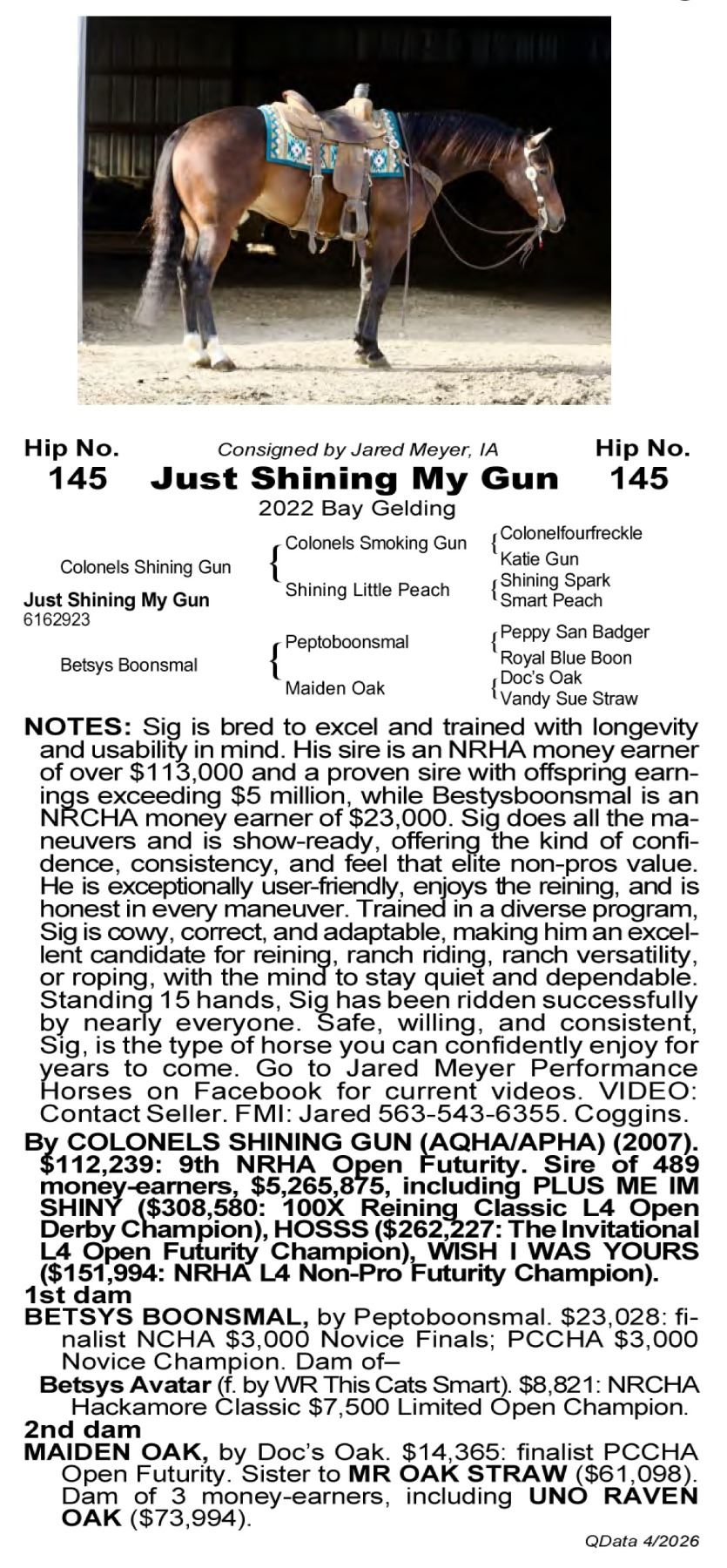 Just Shining My Gun -6162923 - 2022 AQHA Bay Gelding - Jared Meyer, Bernard, IA -Sig is bred to excel and trained with longevity and usability in mind. His sire is an NRHA money earner of over $113,000 and a proven sire with offspring earnings exceeding $5 million, while Bestysboonsmal is an NRCHA money earner of $23,000. Sig does all the maneuvers and is show-ready, offering the kind of confidence, consistency, and feel that elite non-pros value. He is exceptionally user-friendly, enjoys the reining, and is honest in every maneuver. Trained in a diverse program, Sig is cowy, correct, and adaptable, making him and excellent candidate for reining, ranch riding, ranch versatility, or roping, with the mind to stay quiet and dependable. Standing 15 hands, Sig has been ridden successfully by youth riders, non-pros, and professionals alike. He is a simple, uncomplicated gelding with a great demeanor and a lighthearted personality, making him a pleasure to have in the barn and in the show pen. Safe, willing, and consistent, Sig, is the type of horse you can confidently enjoy today and continue to grow with for years to come. Go to Jared Meyer Performance Horses on Facebook for current videos. VIDEO: Contact Seller. FMI: Jared 563-543-6355. Coggins.