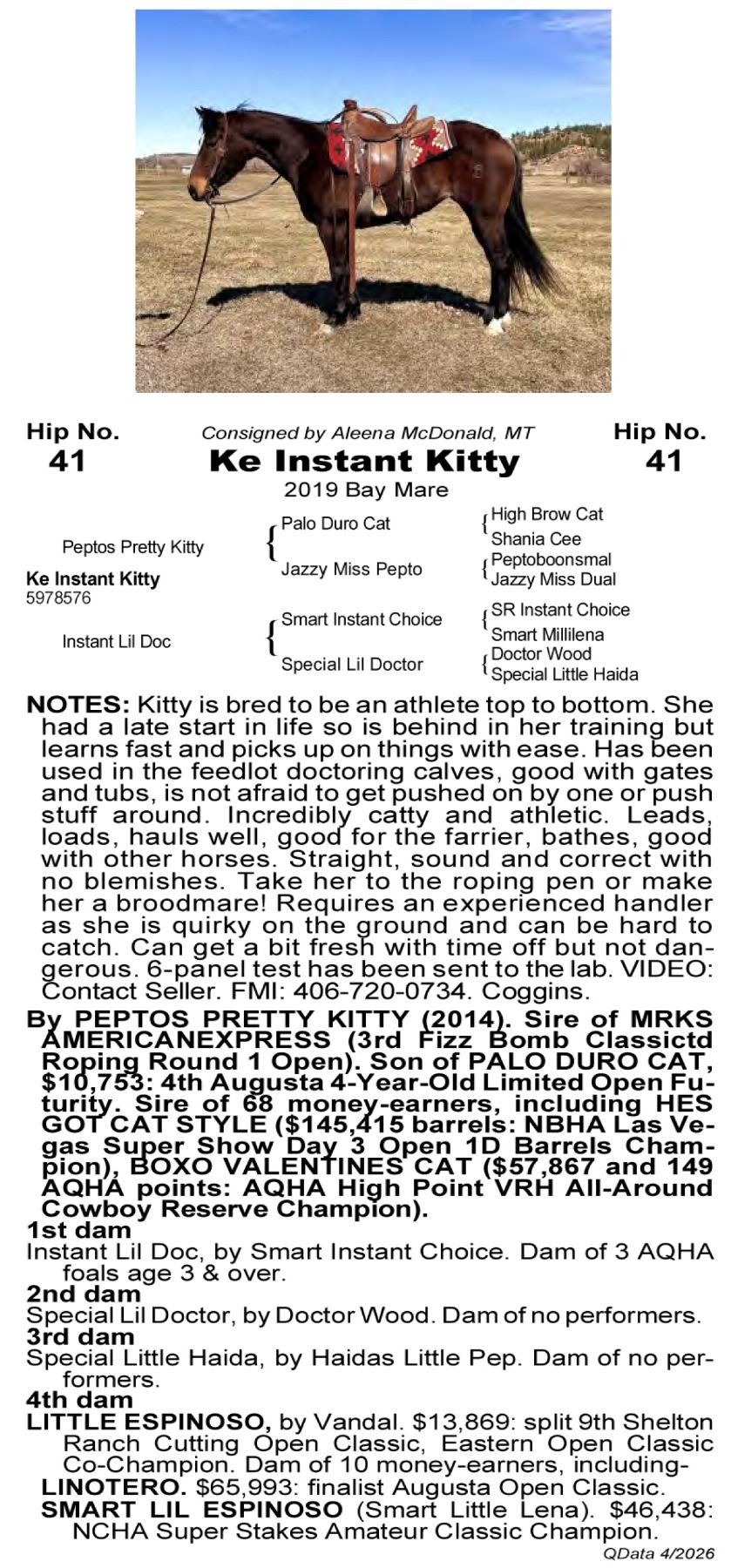 KE Instant Kitty - 5978576 - 2019 AQHA Bay Mare - Aleena McDonald, Lame Deer, MT - Kitty is bred to be an athlete top to bottom. She had a late start in life so is behind in her training but learns fast and picks up on things with ease. Has been used in the feedlot doctoring calves, good with gates and tubs, is not afraid to get pushed on by one or push stuff around. Incredibly catty and athletic. Leads, loads, hauls well, good for the farrier, bathes, good with other horses. Straight, sound and correct with no blemishes. Take her to the roping pen or make her a broodmare; any direction she goes she should succeed! Requires an experienced handler as she is quirky on the ground and can be hard to catch. Can get a bit fresh with time off but not dangerous. 6-panel test has been sent to the lab. VIDEO: Contact Seller. FMI: 406-720-0734. Coggins.