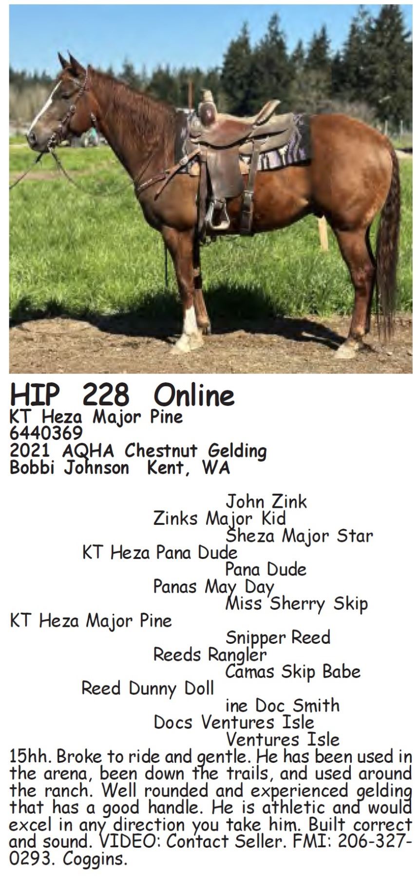 KT Heza Major Pine - 6440369 - 2021 AQHA Chestnut Gelding - Bobbi Johnson, Kent, WA - 15hh. Broke to ride and gentle. He has been used in the arena, been down the trails, and used around the ranch. Well rounded and experienced gelding that has a good handle. He is athletic and would excel in any direction you take him. Built correct and sound. VIDEO: Contact Seller. FMI: 206-327-0293. Coggins.