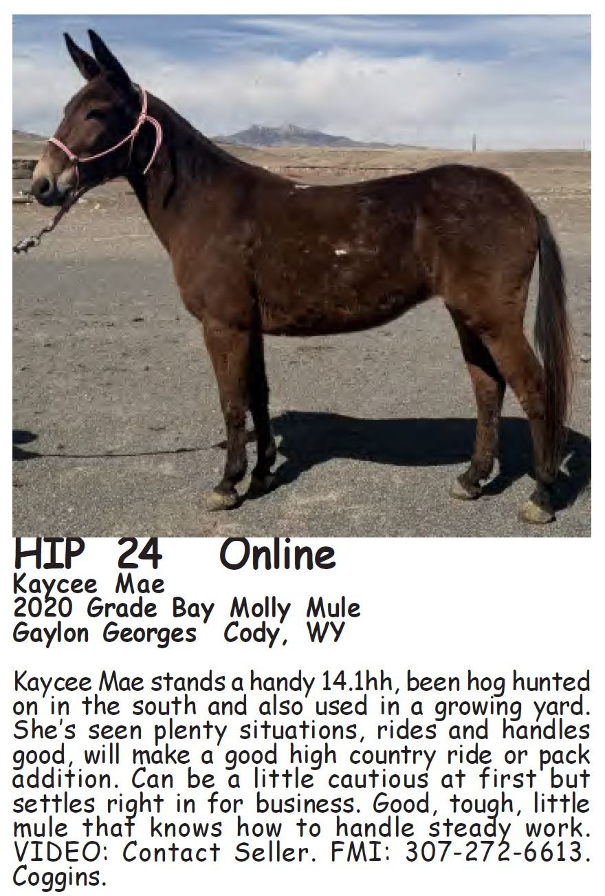 Kaycee Mae - 2020 Grade Bay Molly Mule - Gaylon Georges, Cody, WY - Kaycee Mae stands a handy 14.1hh, been hog hunted on in the south and also used in a growing yard. She’s seen plenty situations, rides and handles good, will make a good high country ride or pack addition. Can be a little cautious at first but settles right in for business. Good, tough, little mule that knows how to handle steady work. VIDEO: Contact Seller. FMI: 307-272-6613. Coggins.