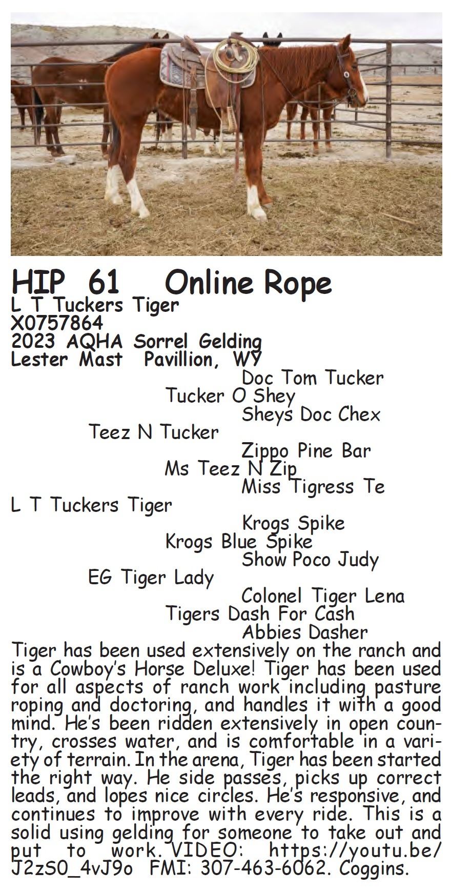 L T Tuckers Tiger - X0757864 - 2023 AQHA Sorrel Gelding - Lester Mast, Pavillion, WY - Tiger has been used extensively on the ranch and is a Cowboy’s Horse Deluxe! Tiger has been used for all aspects of ranch work including pasture roping and doctoring, and handles it with a good mind. He’s been ridden extensively in open country, crosses water, and is comfortable in a variety of terrain. In the arena, Tiger has been started the right way. He side passes, picks up correct leads, and lopes nice circles. He’s responsive, and continues to improve with every ride. This is a solid using gelding for someone to take out and put to work. VIDEO: https://youtu.be/J2zS0_4vJ9o FMI: 307-463-6062. Coggins.