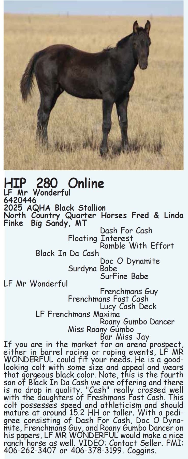 If you are in the market for an arena prospect, either in barrel racing or roping events, LF MR WONDERFUL could fit your needs. He is a good-looking colt with some size and appeal and wears that gorgeous black color. Note, this is the fourth son of Black In Da Cash we are offering and there is no drop in quality. "Cash" really crossed well with the daughters of Freshmans Fast Cash. This colt possesses speed and athleticism and should mature at around 15.2 HH or taller. With a pedigree consisting of Dash For Cash, Doc O Dynamite, Frenchmans Guy, and Roany Gumbo Dancer on his papers, LF MR WONDERFUL would make a nice ranch horse as well. VIDEO: Contact Seller. FMI: 406-262-3407 or 406-378-3199. Coggins.
