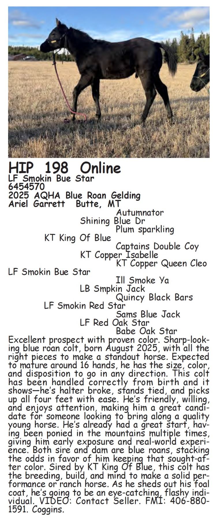 LF Smokin Bue Star - 6454570 - 2025 AQHA Blue Roan Gelding - Ariel Garrett, Butte, MT - Excellent prospect with proven color. Sharp-looking blue roan colt, born August 2025, with all the right pieces to make a standout horse. Expected to mature around 16 hands, he has the size, color, and disposition to go in any direction. This colt has been handled correctly from birth and it shows—he’s halter broke, stands tied, and picks up all four feet with ease. He’s friendly, willing, and enjoys attention, making him a great candidate for someone looking to bring along a quality young horse. He’s already had a great start, having been ponied in the mountains multiple times, giving him early exposure and real-world experience. Both sire and dam are blue roans, stacking the odds in favor of him keeping that sought-after color. Sired by KT King Of Blue, this colt has the breeding, build, and mind to make a solid performance or ranch horse. As he sheds out his foal coat, he’s going to be an eye-catching, flashy individual. VIDEO: Contact Seller. FMI: 406-880-1591. Coggins.