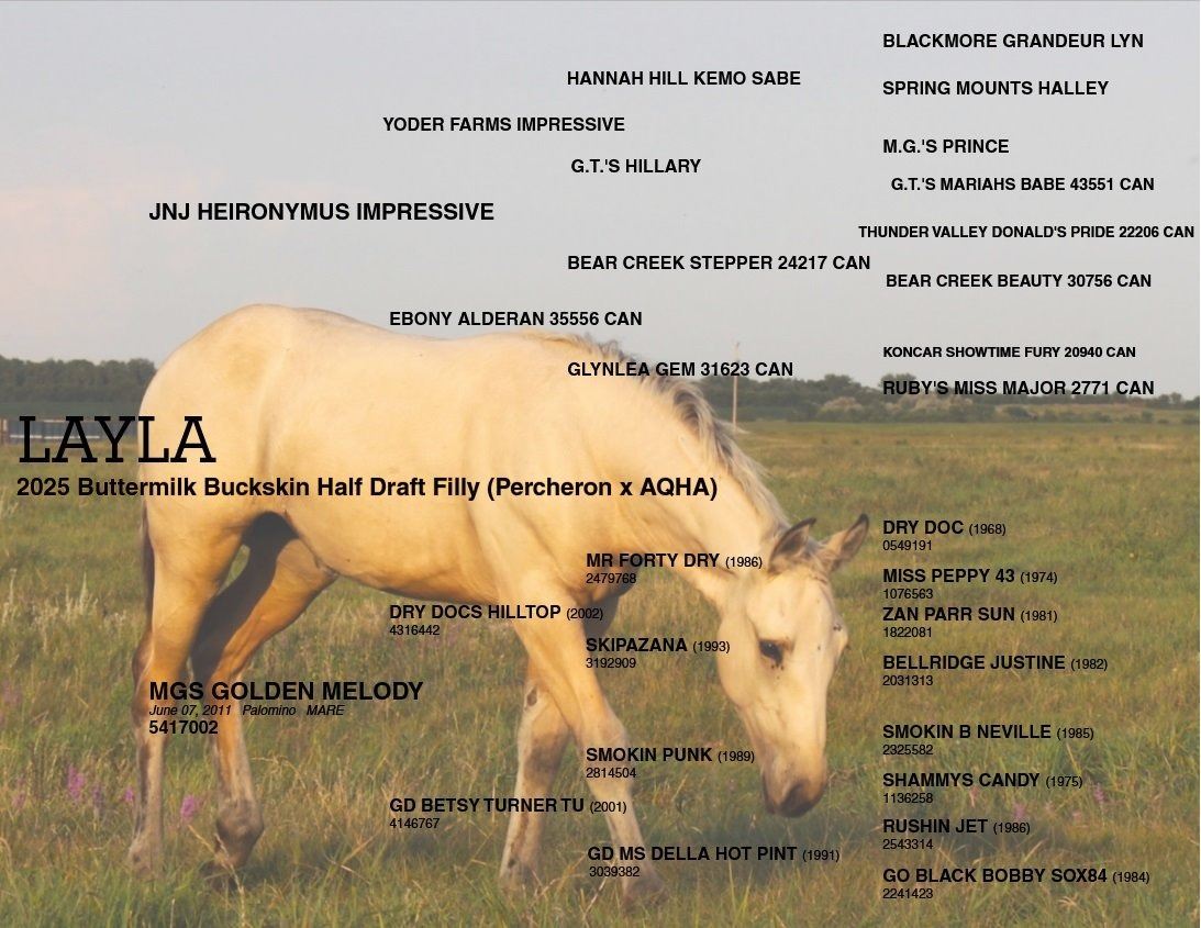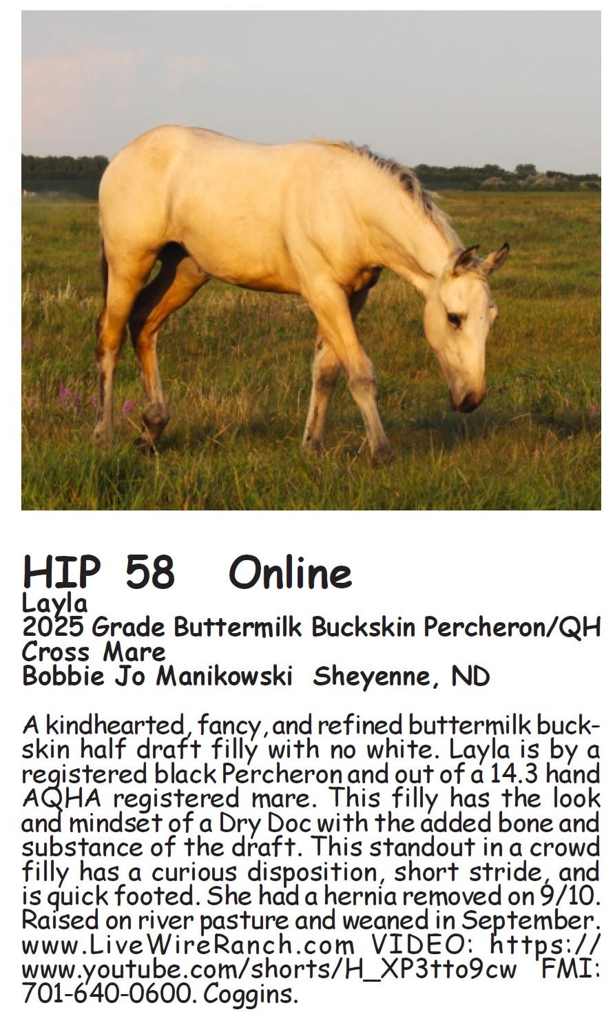 A kindhearted, fancy, and refined buttermilk buckskin half draft filly with no white. Layla is by a registered black Percheron and out of a 14.3 hand AQHA registered mare. This filly has the look and mindset of a Dry Doc with the added bone and substance of the draft. This standout in a crowd filly has a curious disposition, short stride, and is quick footed. She had a hernia removed on 9/10. Raised on river pasture and weaned in September. www.LiveWireRanch.com VIDEO: https://www.youtube.com/shorts/H_XP3tto9cw FMI: 701-640-0600. Coggins.