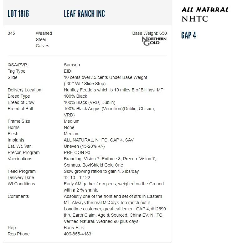 Comments Absolutly one of the front end set of strs in Eastern MT. Always the real McCoys.Top ranch outfit. Longtime customer, great cattlemen. GAP 4, #12590 thru Earth Claim, Age & Sourced, China EV, NHTC, Verified Natural. Weaned 90 plus days.