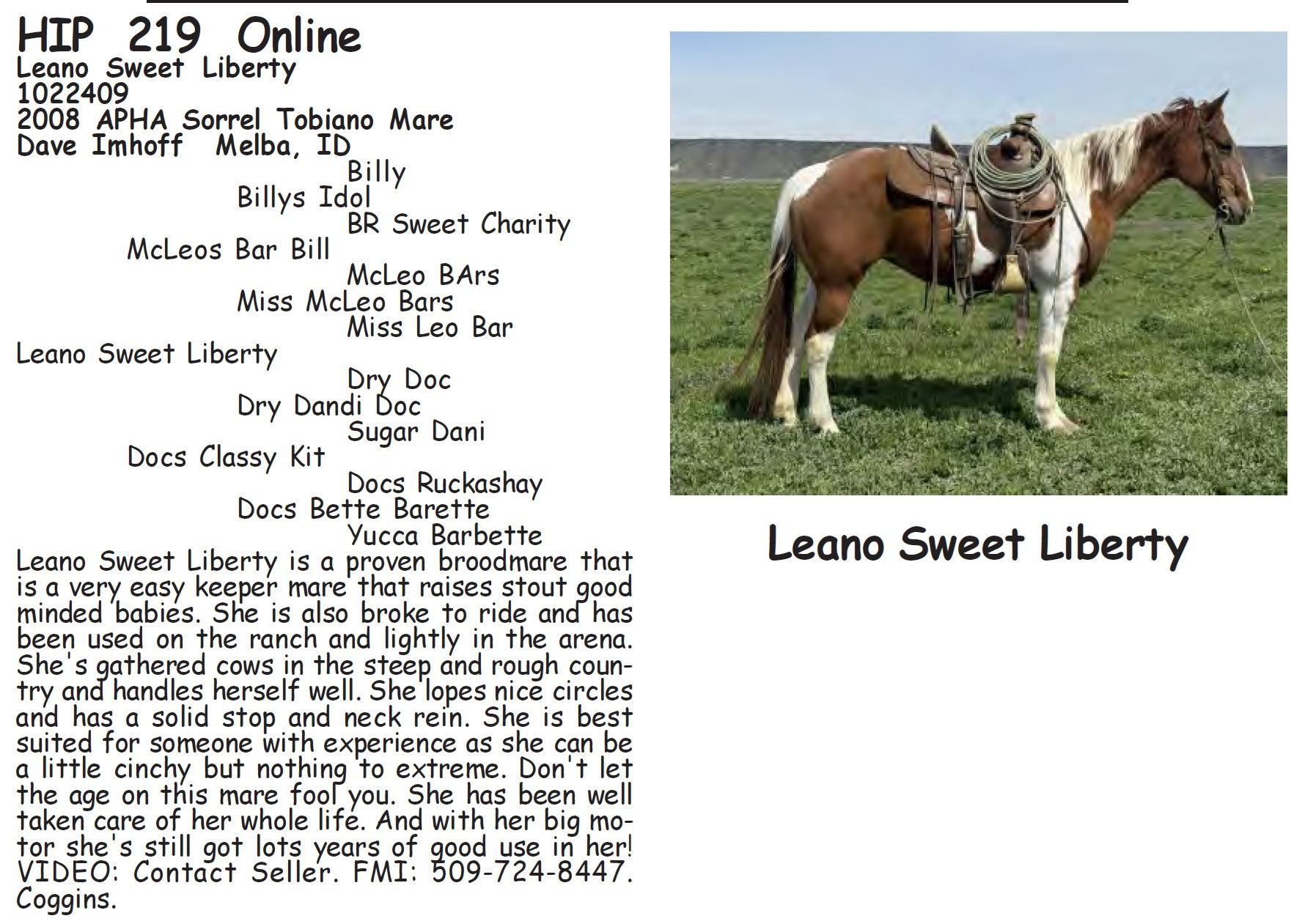 Leano Sweet Liberty - 1022409 - 2008 APHA Sorrel Tobiano Mare - Dave Imhoff, Melba, ID - Leano Sweet Liberty is a proven broodmare that is a very easy keeper mare that raises stout good minded babies. She is also broke to ride and has been used on the ranch and lightly in the arena. She's gathered cows in the steep and rough country and handles herself well. She lopes nice circles and has a solid stop and neck rein. She is best suited for someone with experience as she can be a little cinchy but nothing to extreme. Don't let the age on this mare fool you. She has been well taken care of her whole life. And with her big motor she's still got lots years of good use in her! VIDEO: Contact Seller. FMI: 509-724-8447. Coggins.