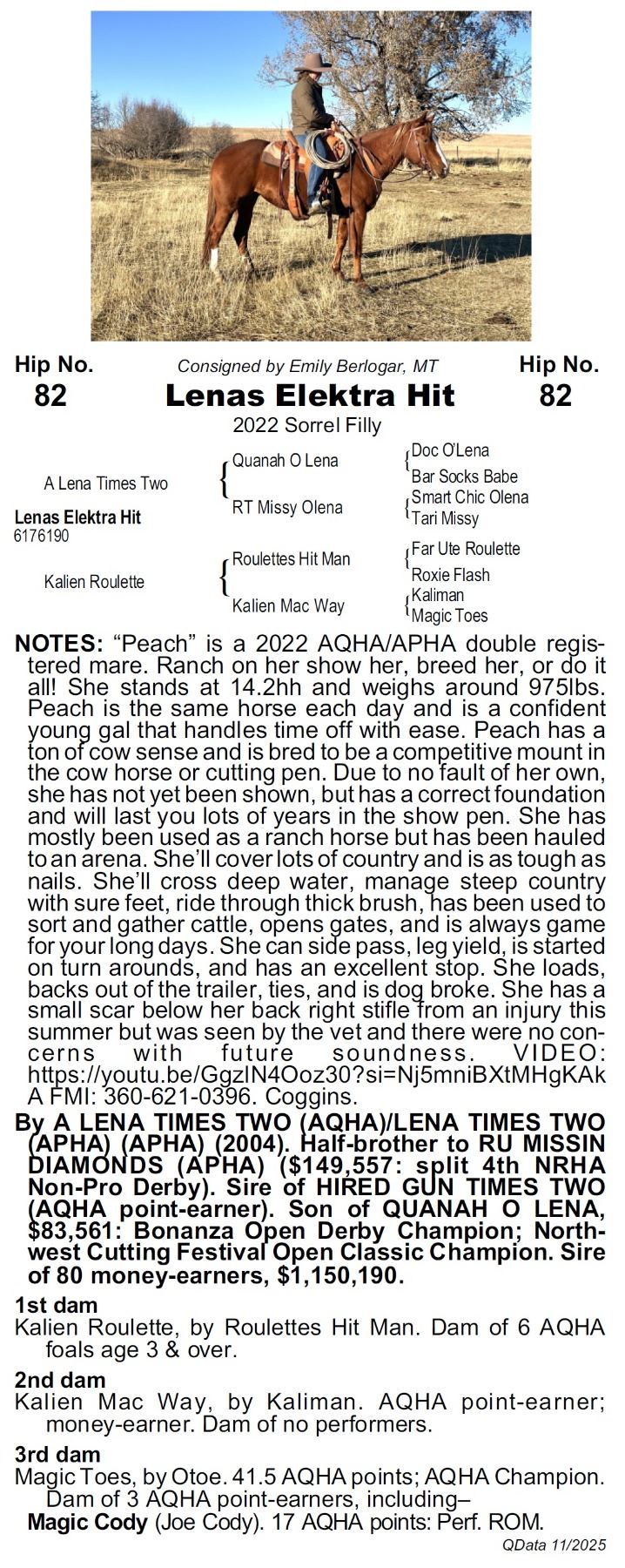 2022 AQHA/APHA Sorrel Mare x A Lena Times Two x Quanah O Lena out of Kalien Roulette x Roulettes Hit Man. Peach" is a 2022 AQHA/APHA DUAL registered mare. Ranch on her show her, breed her, or do it all! She stands at 14.2hh and weighs around 975lbs. Peach is the same horse each day and is a confident young gal that handles time off with ease. We have four horses by the same stud and all of them are incredibly smart and easy to work with. Peach has a ton of cow sense and is bred to be a competitive mount in the cow horse or cutting pen. Due to no fault of her own, she has not yet been shown and is still greener on the performance side of her repertoire, but has a correct foundation and will last you lots of years in the show pen. Her long flaxen mane and big blaze will definitely get you noticed by the judge. She has mostly been used as a ranch horse but has been hauled to an arena to work on the technical things as much as possible. She'll cover lots of country and is as tough as nails. She'll cross deep water, manage steep country with sure feet, ride through thick brush, has been used to sort and gather cattle, opens gates, and is always game for your long days. She has not been roped off of yet but is just fine with the rope and has drug logs no problem. She can side pass, leg yield, is started on turn arounds, and has an excellent stop. She loads, backs out of the trailer, ties, and is dog broke. Peach also has the papers to produce some great babies in the future. She's a fancy little mare that will make someone a fun partner for years to come. She has a small scar below her back right stifle from an injury this summer but was seen by the vet and there were no concerns with future soundness. Her back has some white marks from a saddle that was used only for 3 months, they should shed out with her next hair coat. She has a very small scar on left front coronet band from when she was a yearling which has never presented any soundness concerns and is superficial. VIDEO: https://youtu.be/GgzlN4Ooz30?si=Nj5mniBX. Coggins.